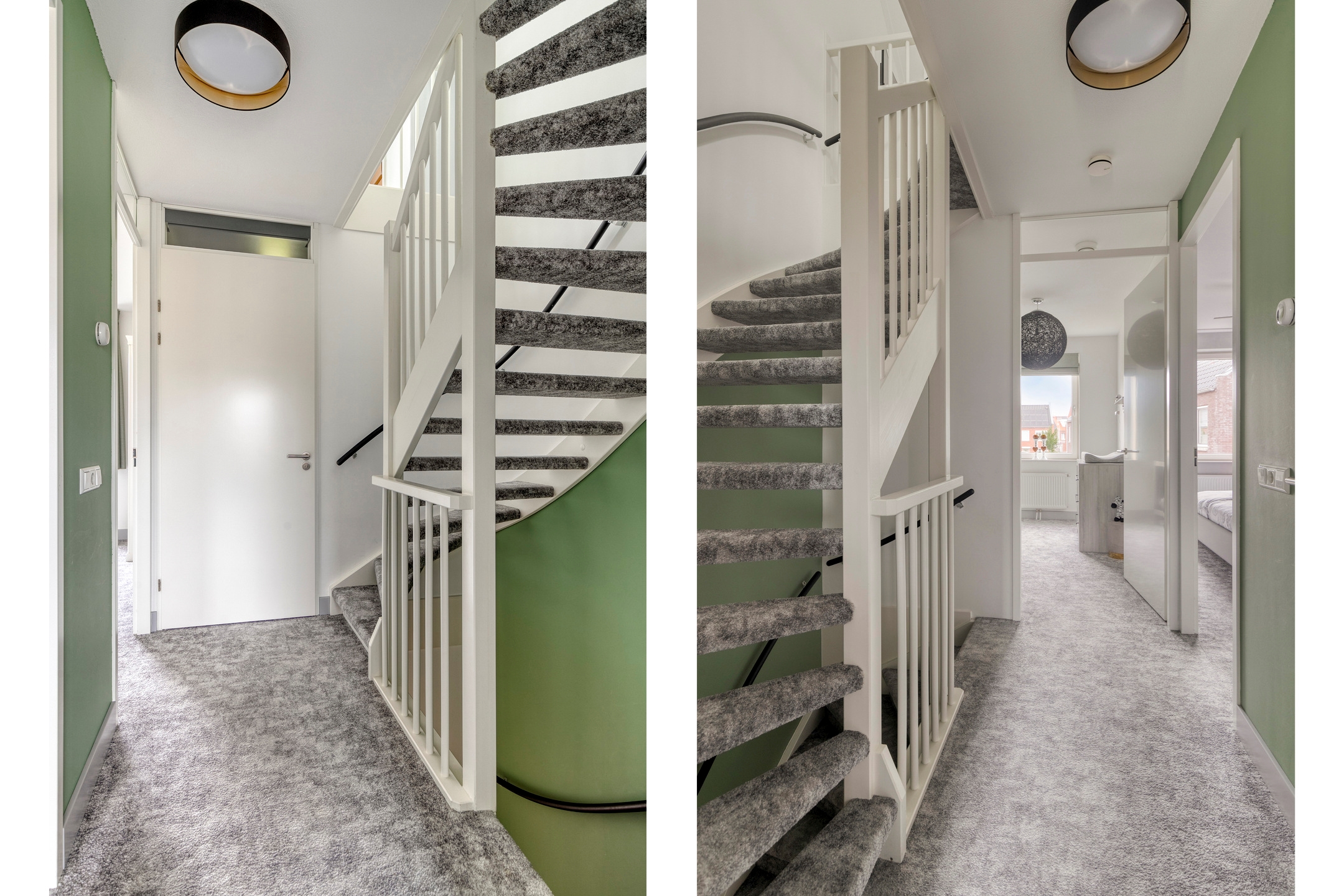 De overloop, slaapkamers en trapopgang naar de tweede verdieping zijn voorzien van een tapijt vloerafwerking.
