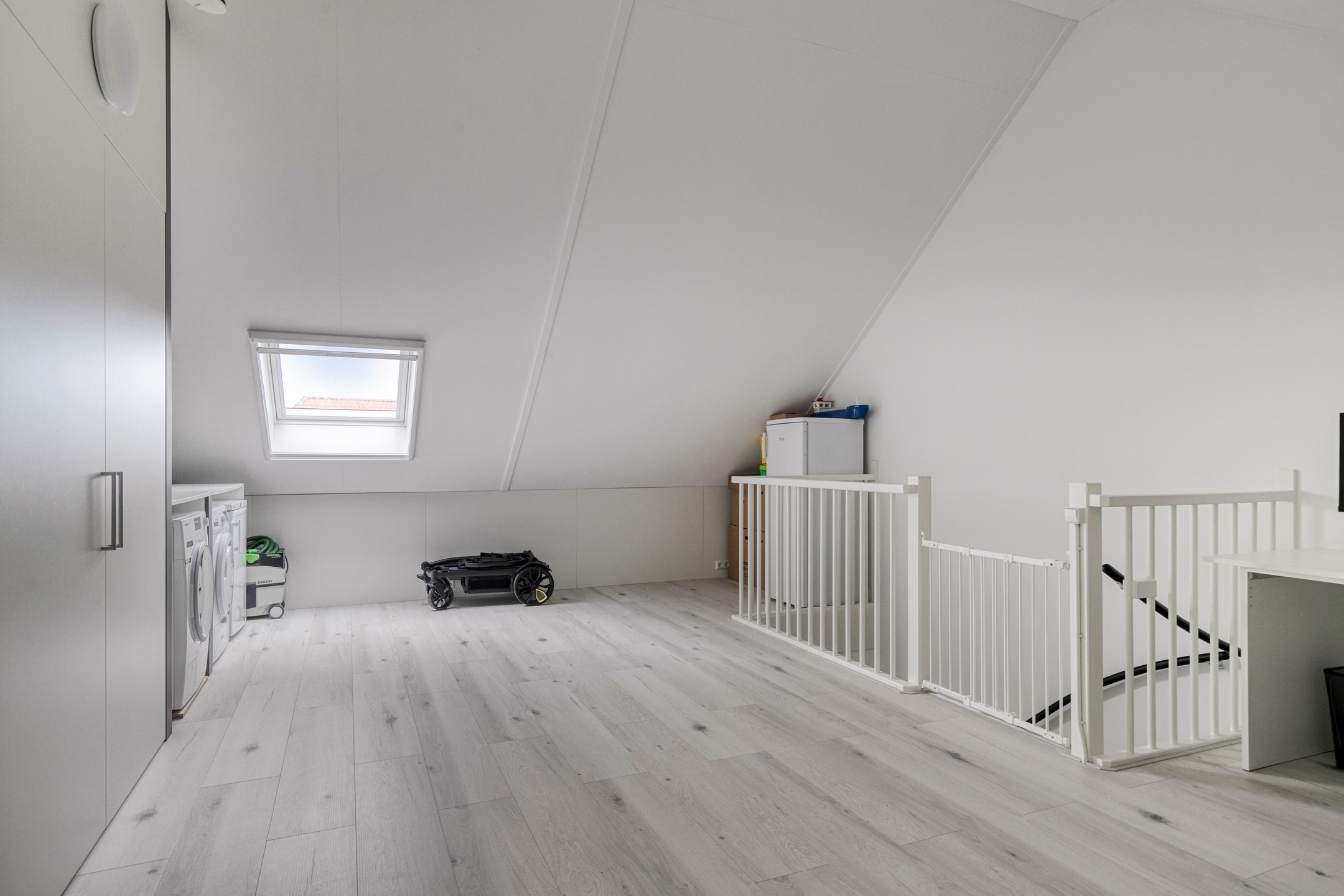 Zolderkamer, een zeer riante zolderkamer, voorzien van een laminaat vloerafwerking, grote maatwerk kastenwand (waarbij rekening is gehouden met het realiseren van 2 slaapkamers), wasmachine- en drogeraansluiting en opstelling cv-ketel.