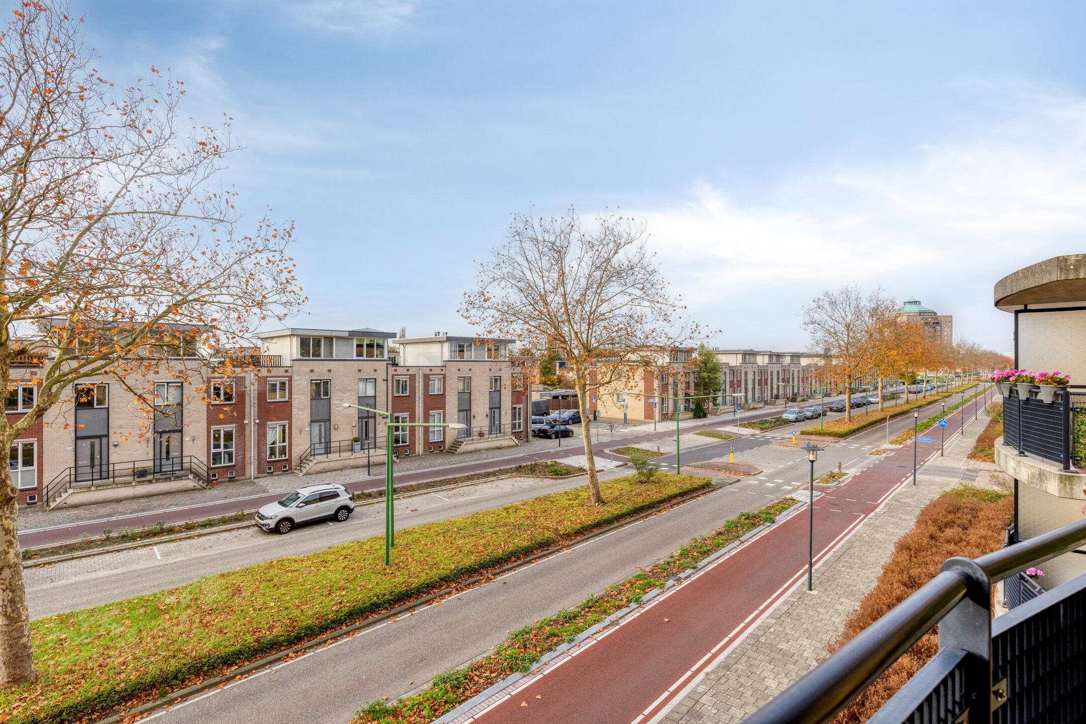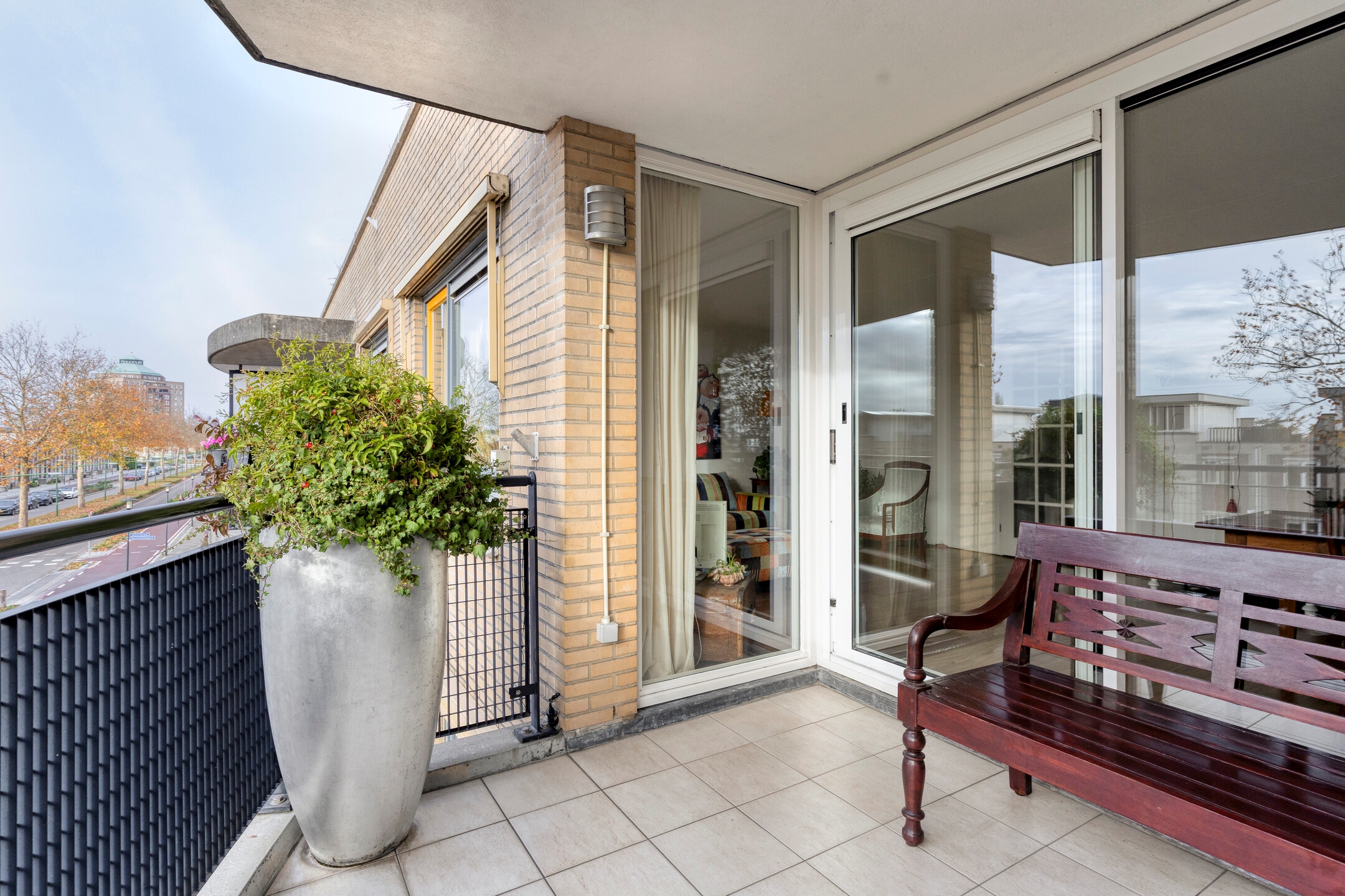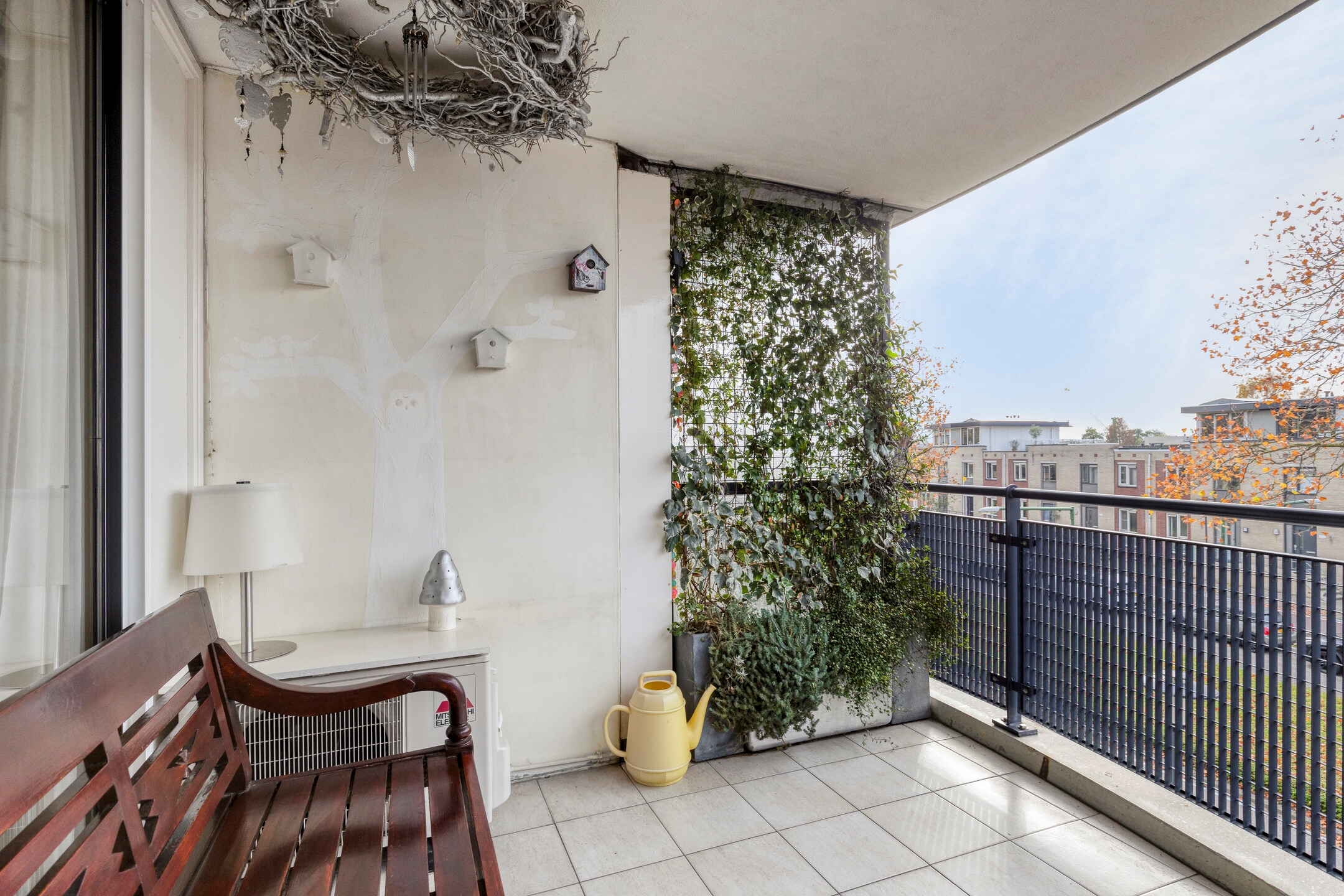 Balkon, een royaal en zonnig balkon (zuiden) met levendig uitzicht, voorzien van tegels op de vloer.