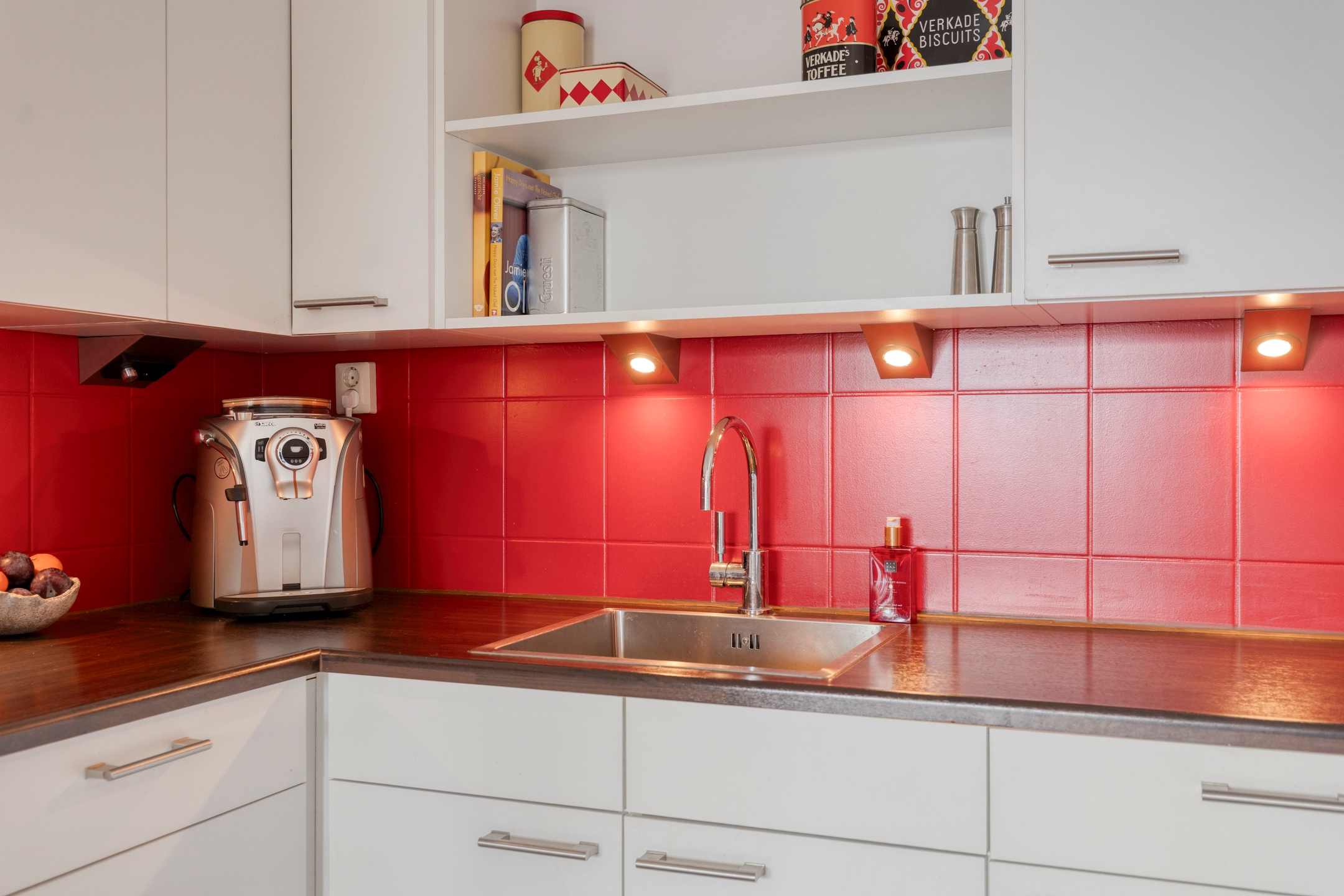Keuken, voorzien van een keukenblok in L-vormige opstelling, met gaskookplaat en afzuigkap.