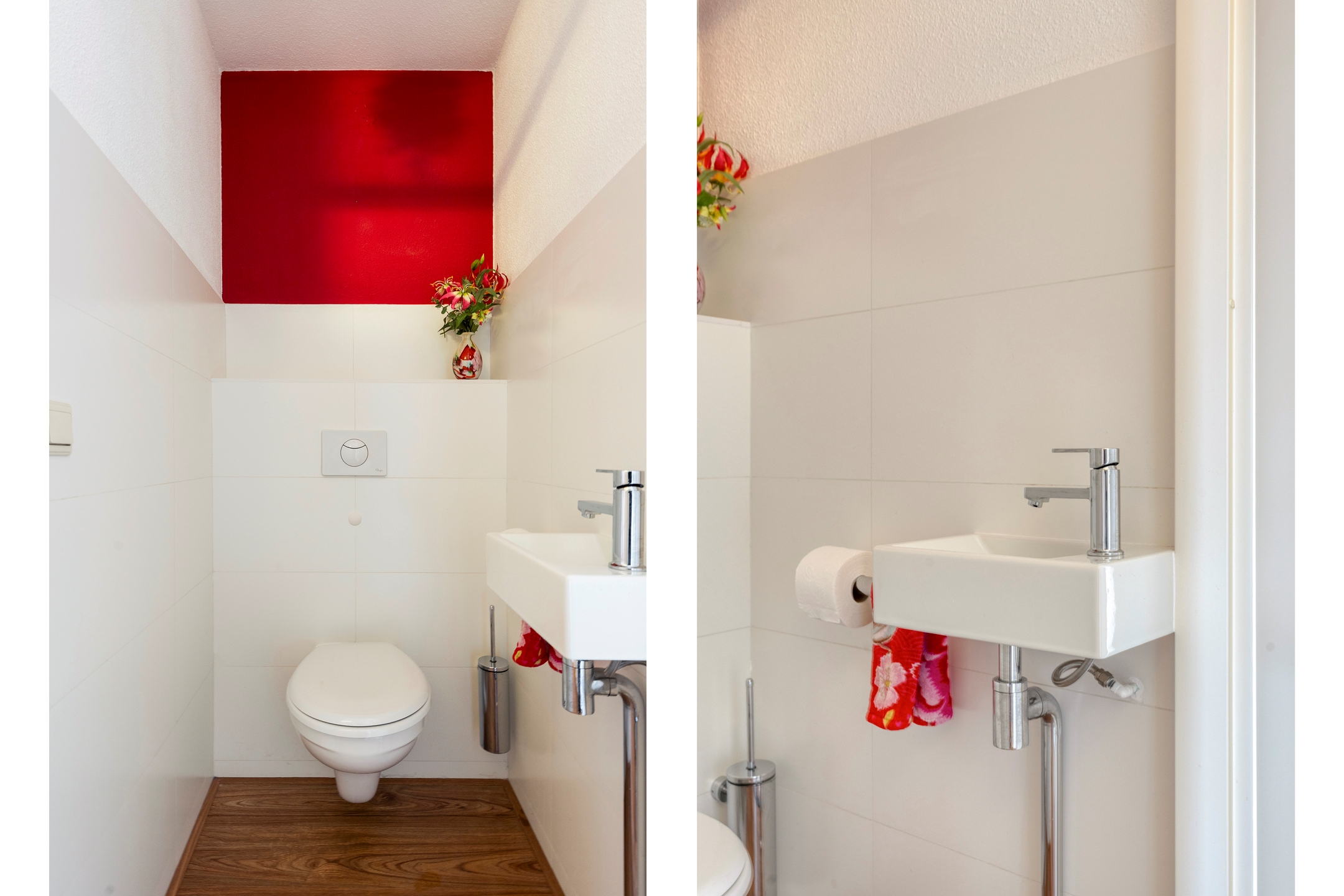 Toilet, gedeeltelijk betegeld, voorzien van aan hangend closet en fonteintje.