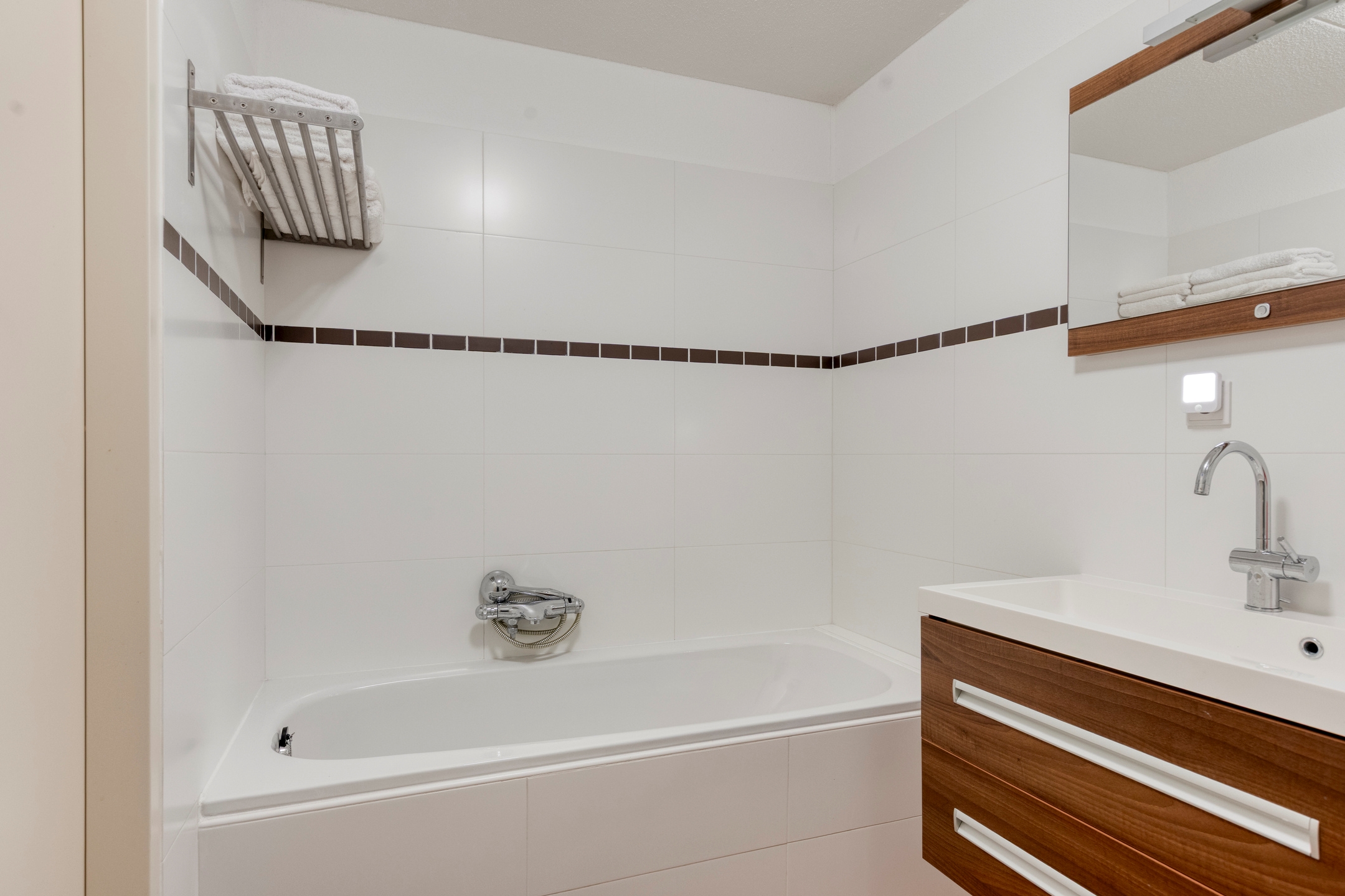 Badkamer, een ruime badkamer met grotendeels tegels op de muren, voorzien van een ligbad met thermostaatkraan, ruime douchecabine met thermostaatkraan, wastafel met onderladen en spiegel met verlichting, mechanische ventilatie en een badkamerradiator.