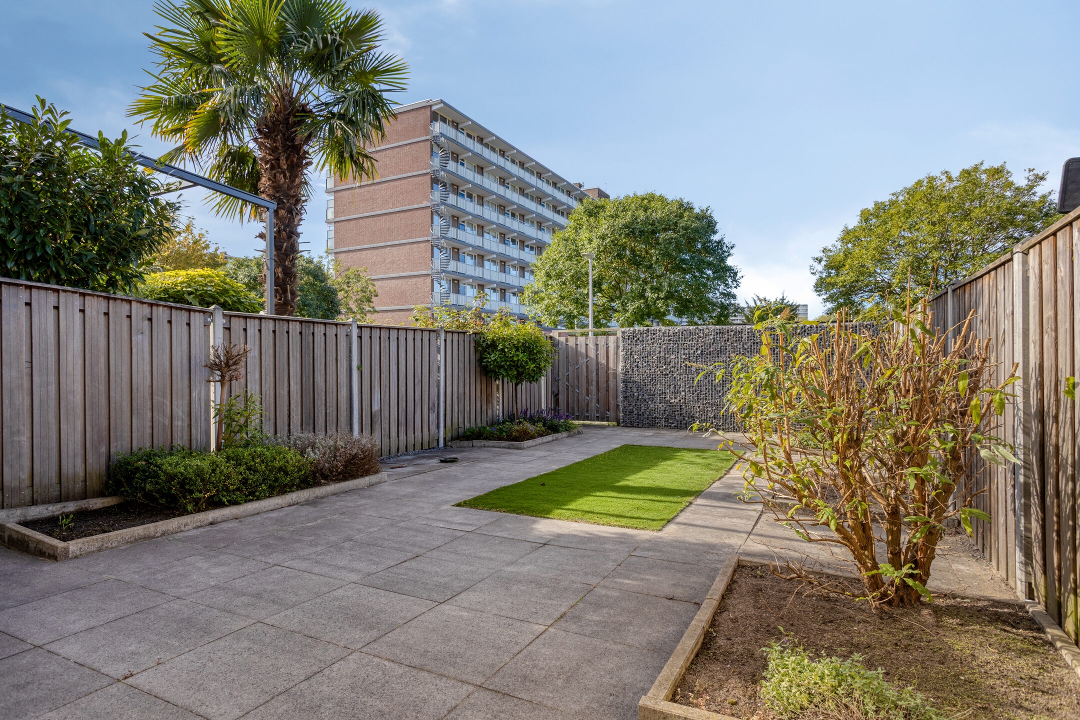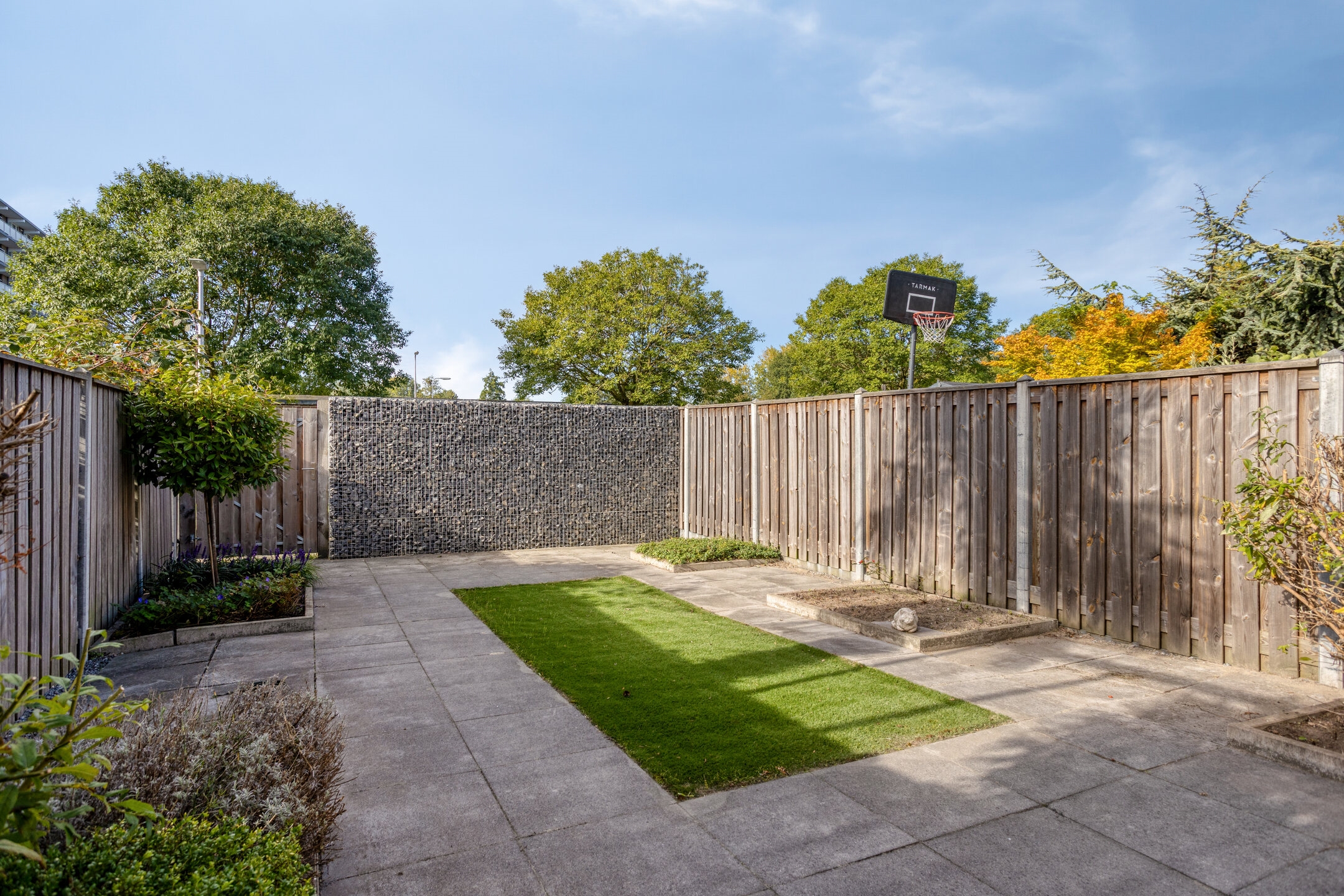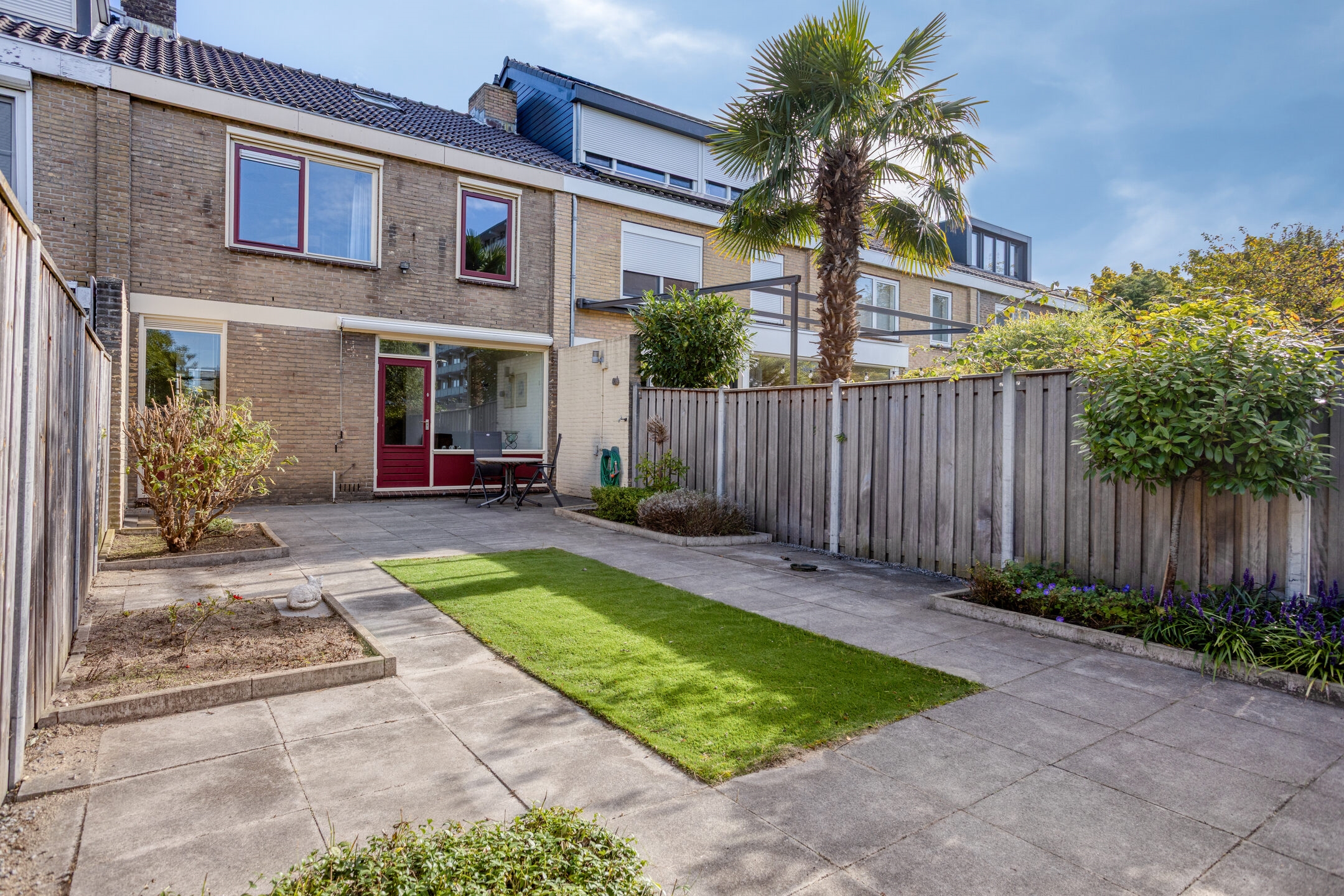 Achtertuin, een diepe tuin voorzien van diverse groen, kunstgras en sierbestrating. Daarnaast bevat de tuin een achterom en een zonwering.