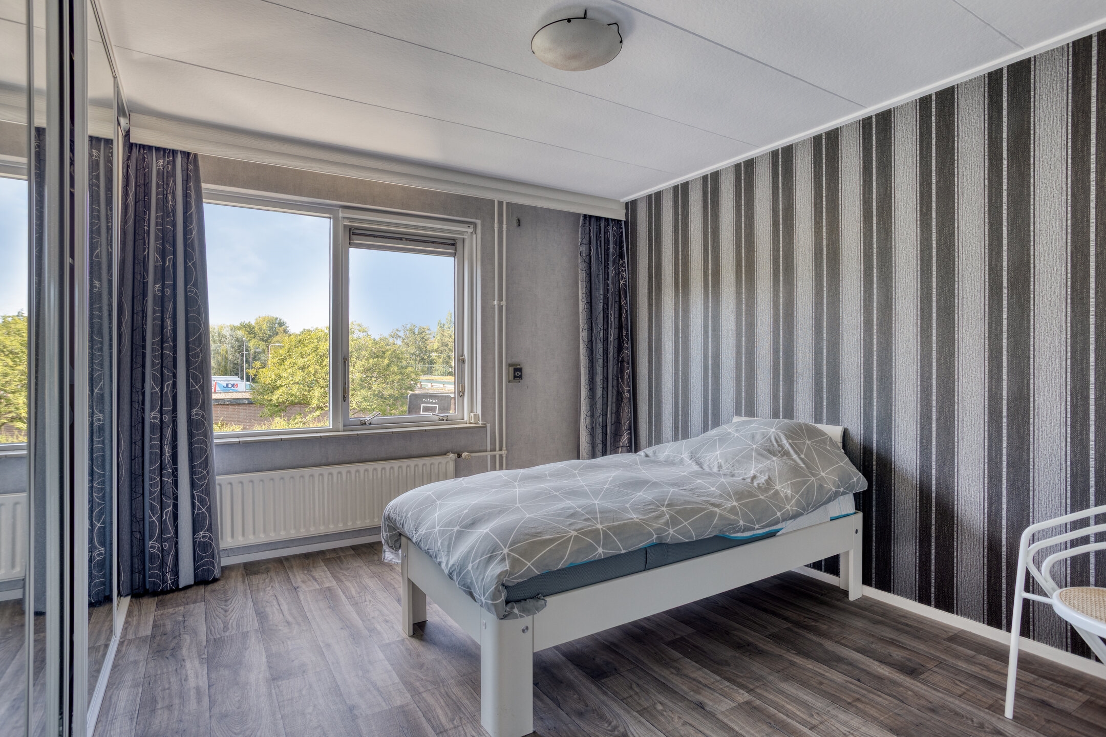 Slaapkamer 1, een royale kamer aan de achterzijde, voorzien van een grote kast met schuif(spiegel)deuren, elektrische zonwering (screen) en zeil op de vloer.