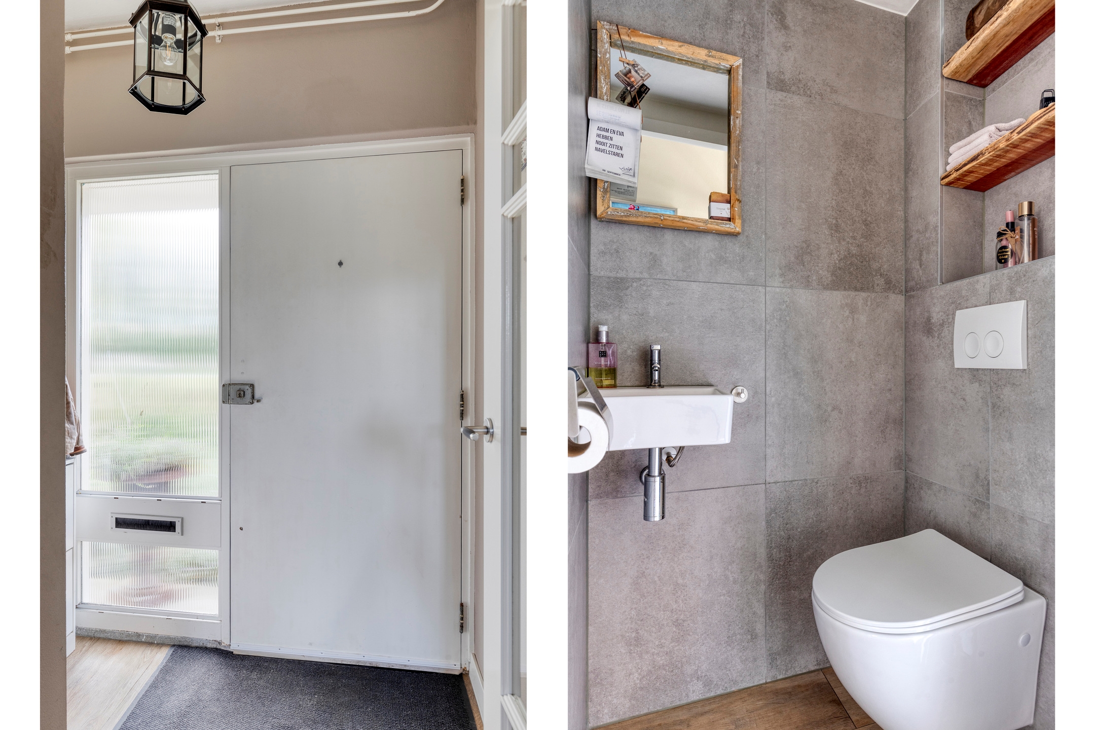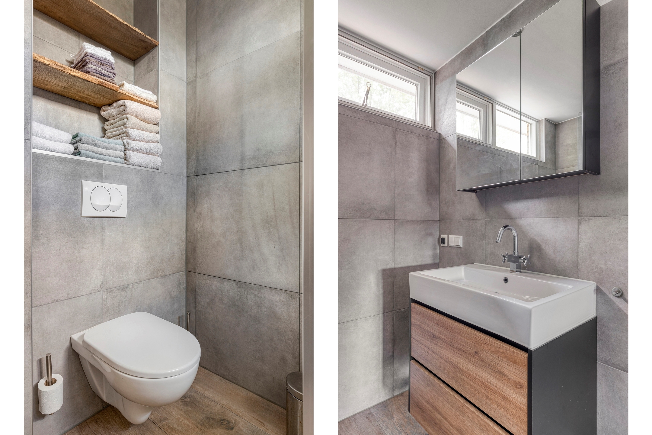Toilet, vernieuwd in 2019, geheel betegeld en voorzien van een hangend closet en een fonteintje.
