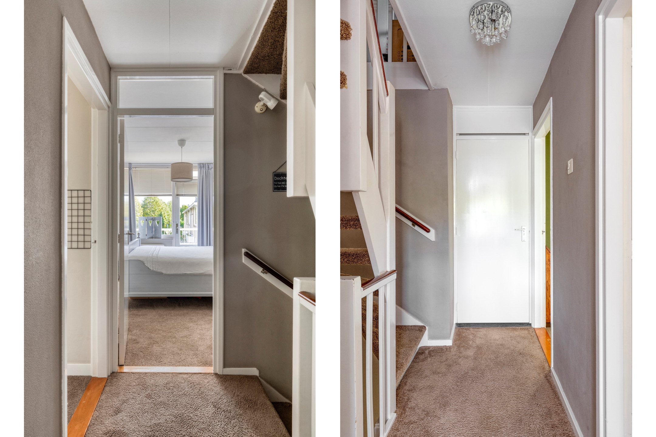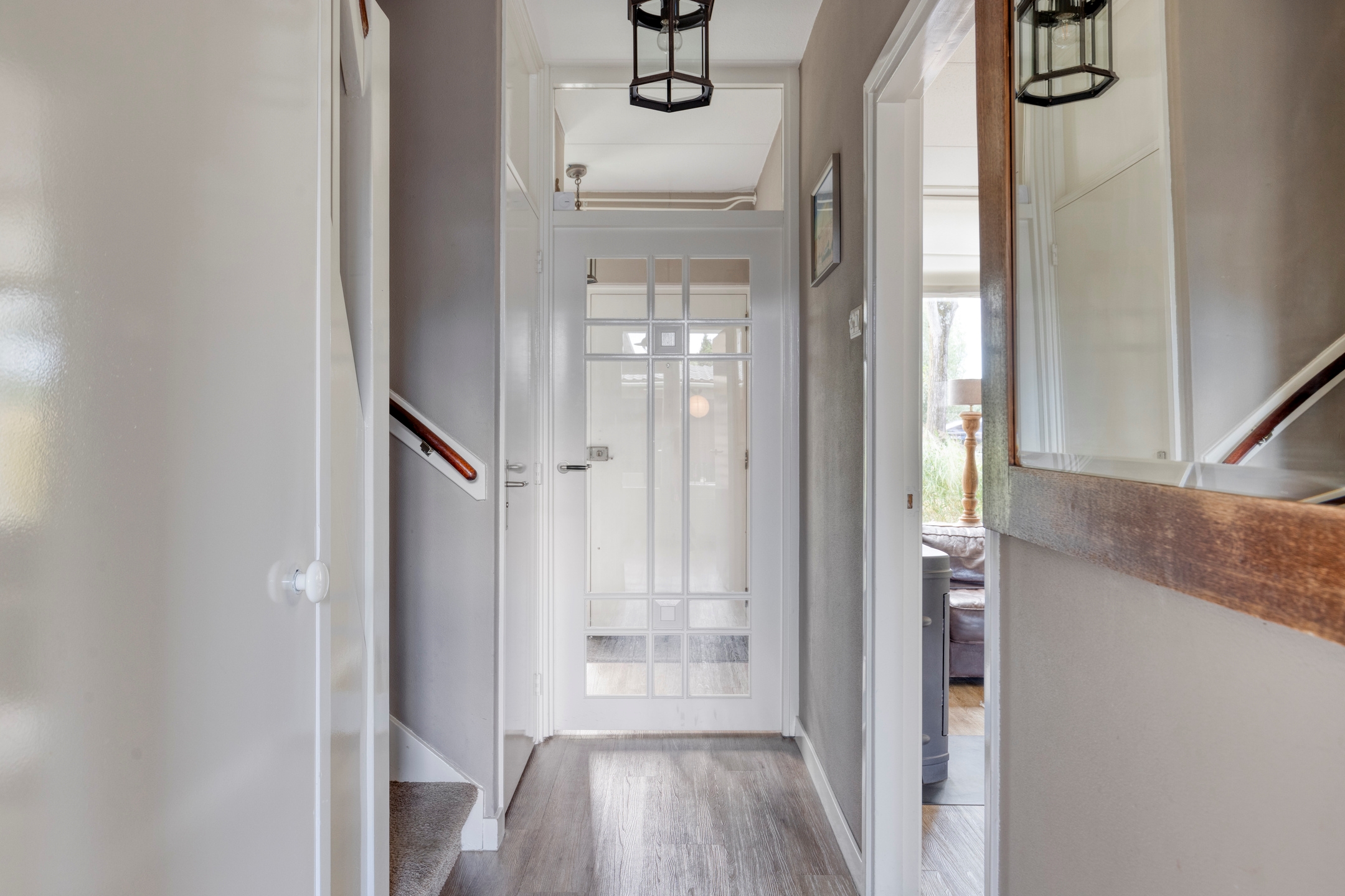 Entree/hal, biedt toegang tot de woonkamer, toilet, keuken, kast onder de trap en de gestoffeerde trapopgang naar de eerste verdieping.