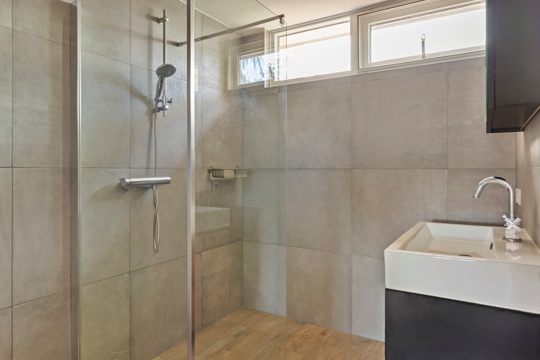 Badkamer, een moderne badkamer die in 2018 is vernieuwd, geheel betegeld en voorzien van een inloopdouche met thermostaatkraan, een wastafel met onderladen en een spiegelkast, een tweede toilet (hangend closet), een te openen raam en mechanische ventilatie.