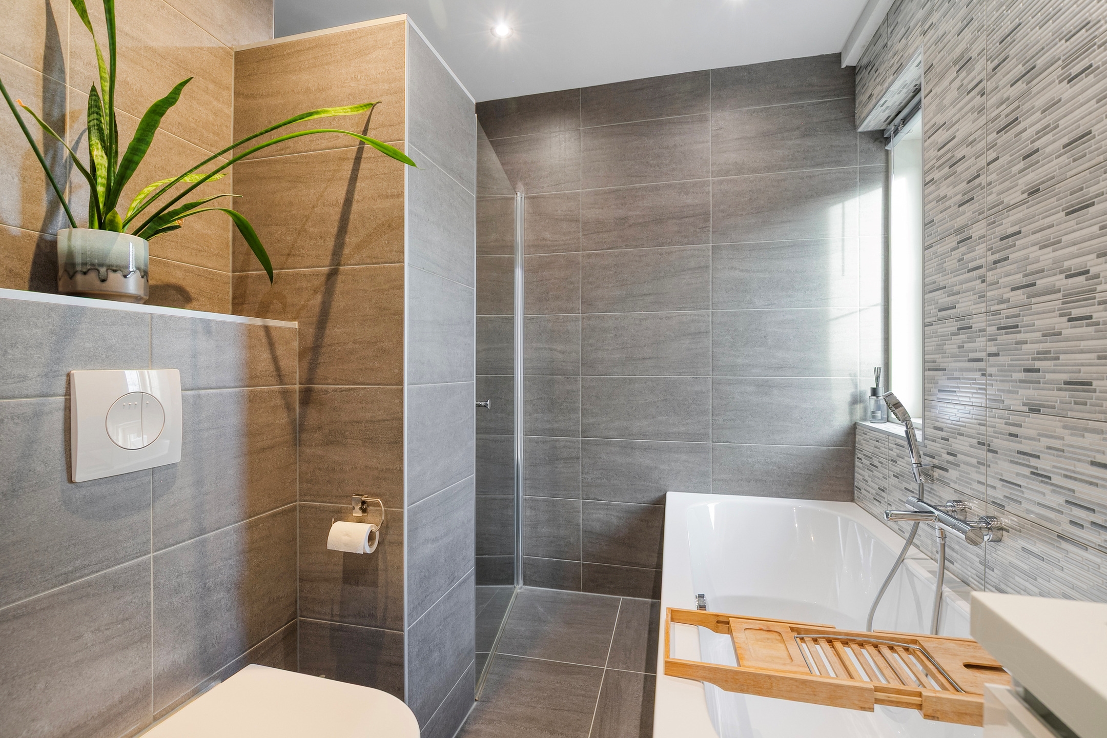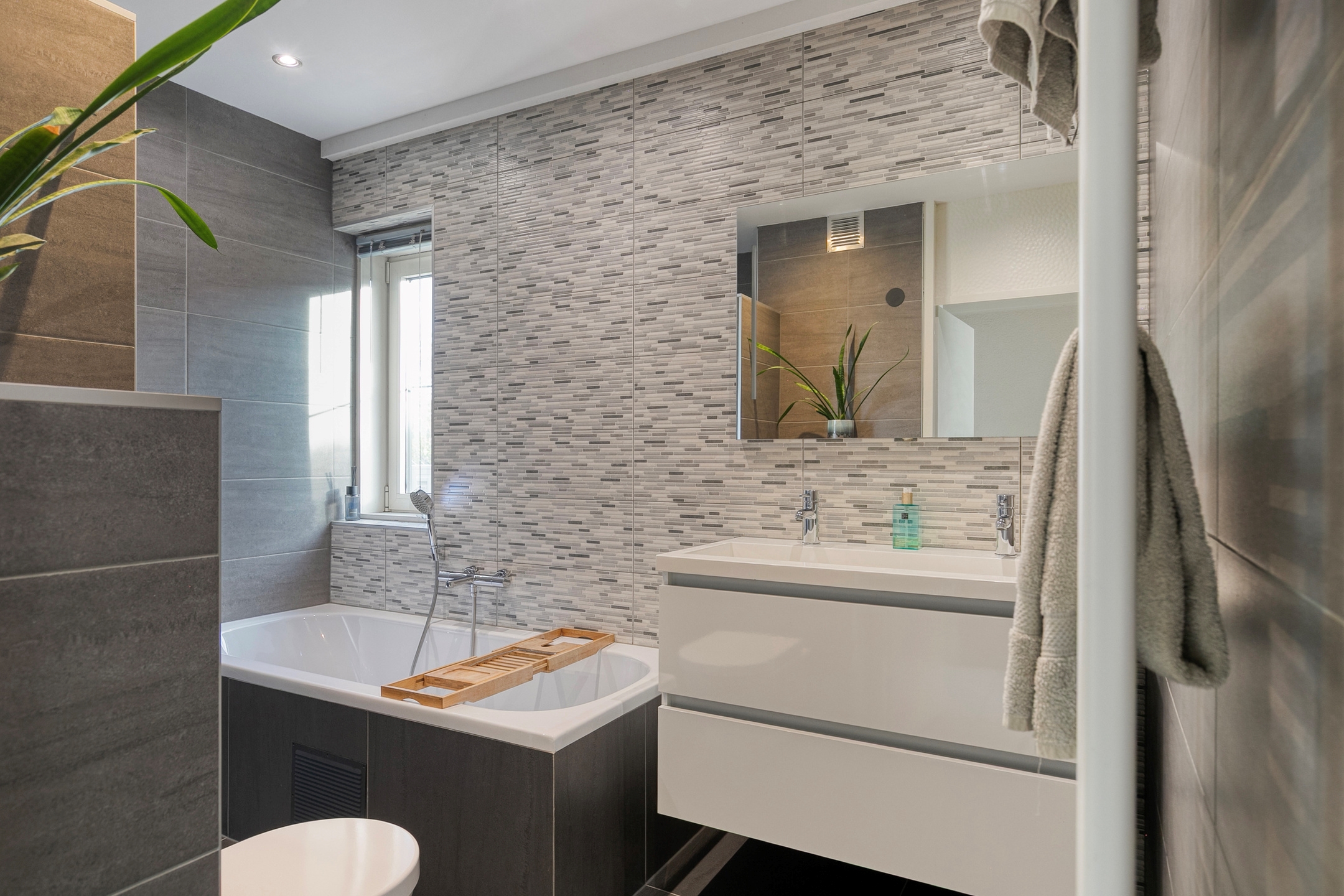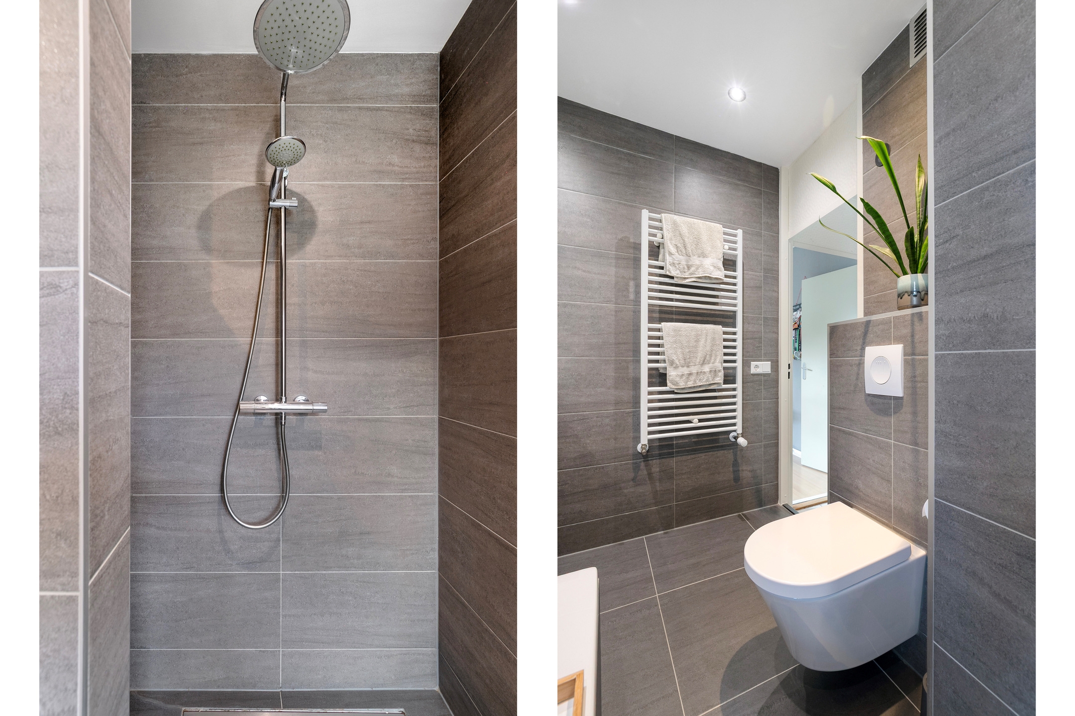 Badkamer (2020): moderne en geheel betegelde ruimte voorzien van een groot ligbad met thermostaatkraan en handdouche, inloopdouche met thermosstaatkraan, rainshower en handdouche, wastafel met onderladen en 2 mengkranen, spiegel met verlichting, tweede toilet (hangend closet), badkamerradiator en een te openen raam.