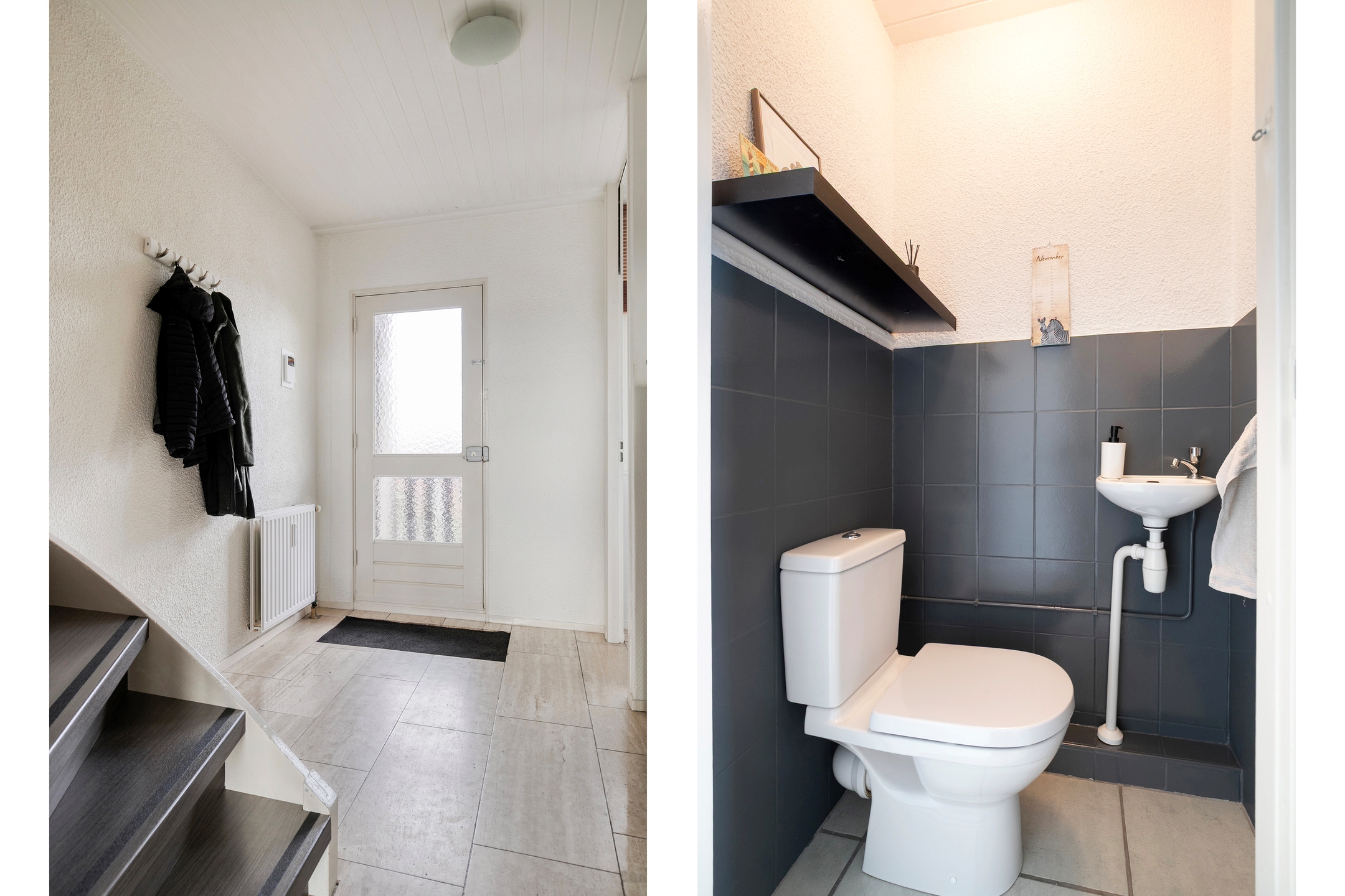 Toilet: grotendeels betegeld en voorzien van een staand closet en een fonteintje.