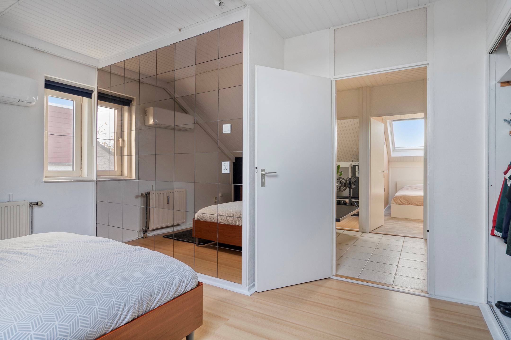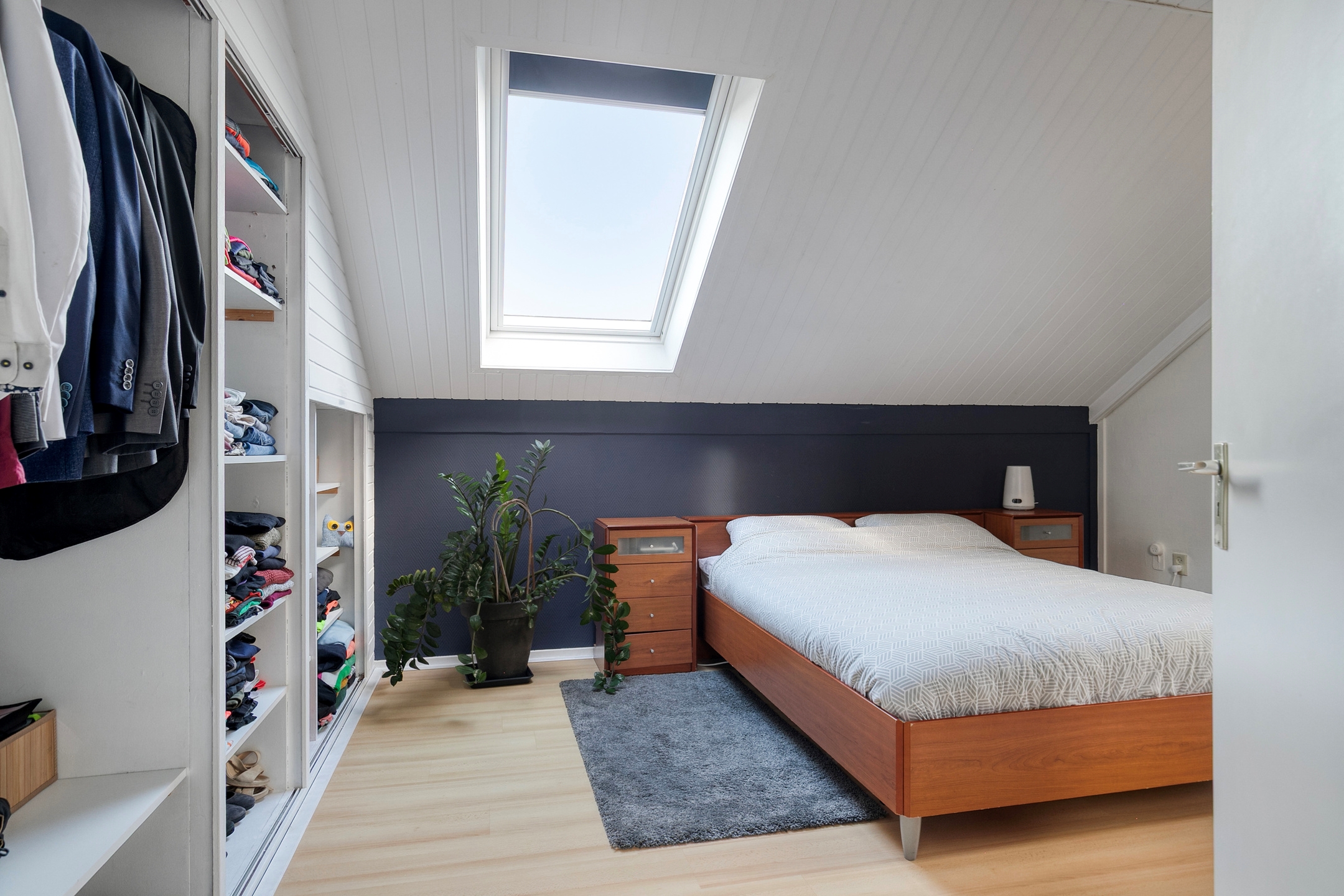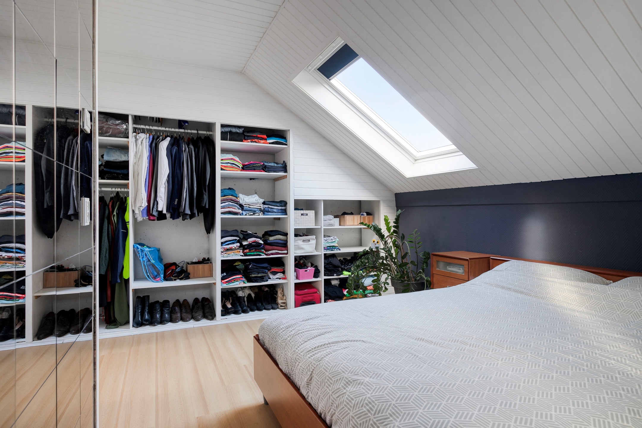 Slaapkamer 1: ruime slaapkamer, gelegen aan de voorzijde en voorzien van airconditioning, een grote kastenwand en een kunststof Velux dakraam met verduisterend rolgordijn.