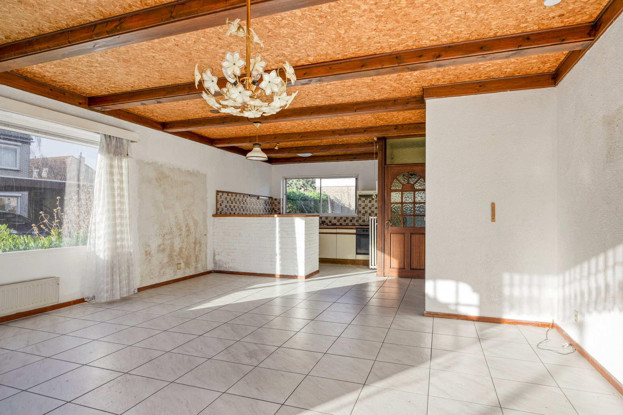 Woonkamer, een ruime en lichte woonkamer door een groot zijraam dankzij de hoekligging, biedt toegang tot de keuken, kast onder de trap en de achtertuin.