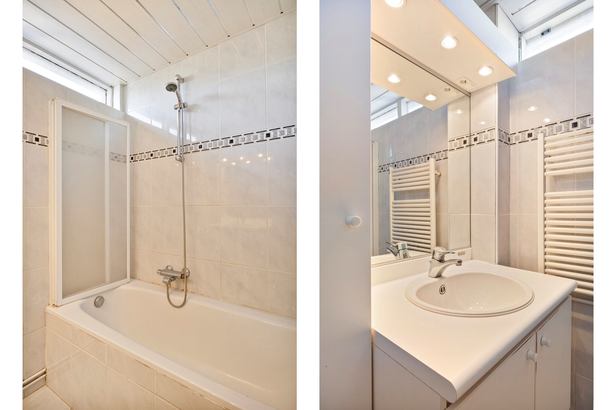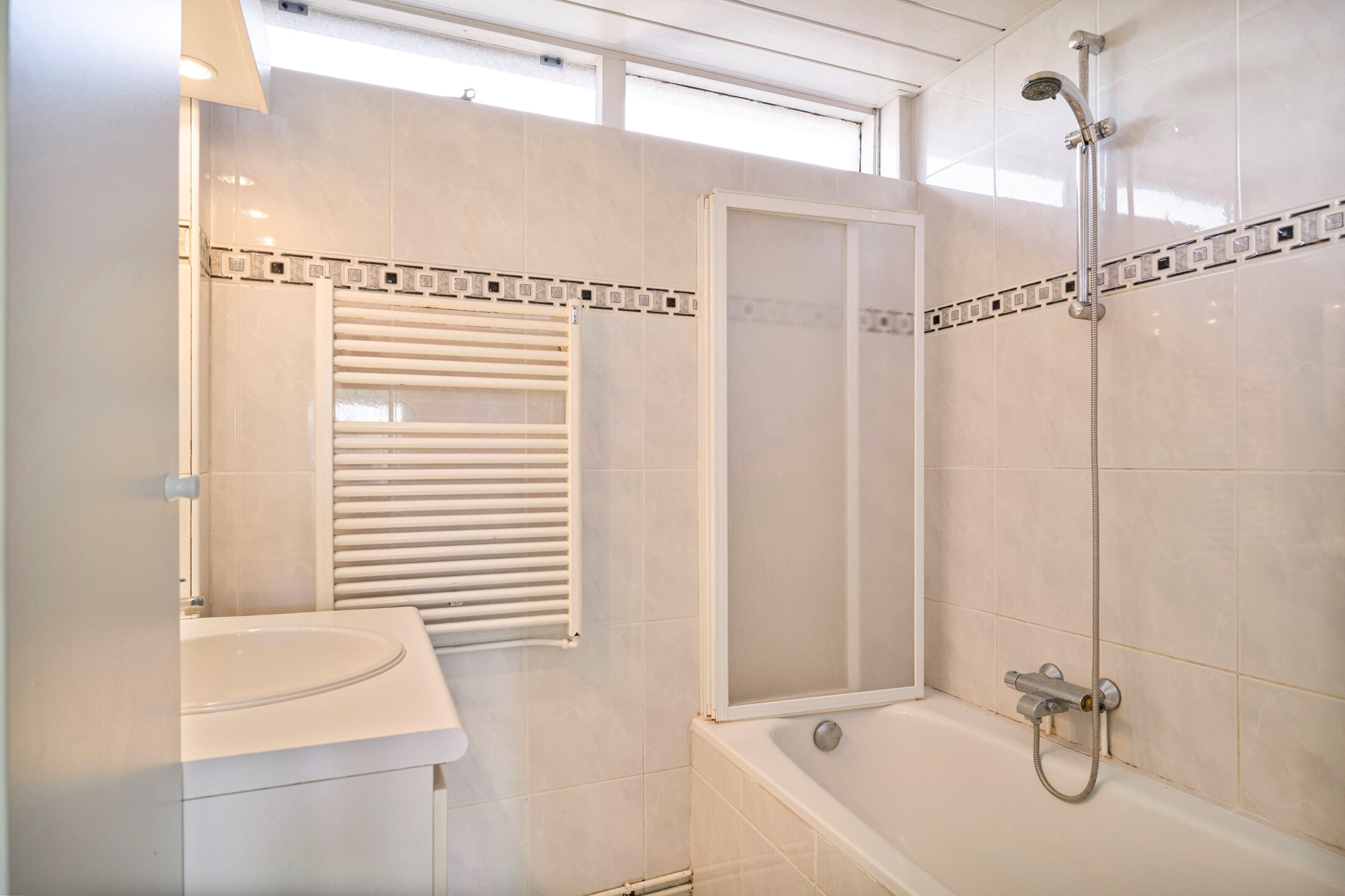Badkamer, geheel betegeld, voorzien van een ligbad met handdouche, badkamermeubel met wastafel en spiegel met verlichting, en een badkamerradiator.