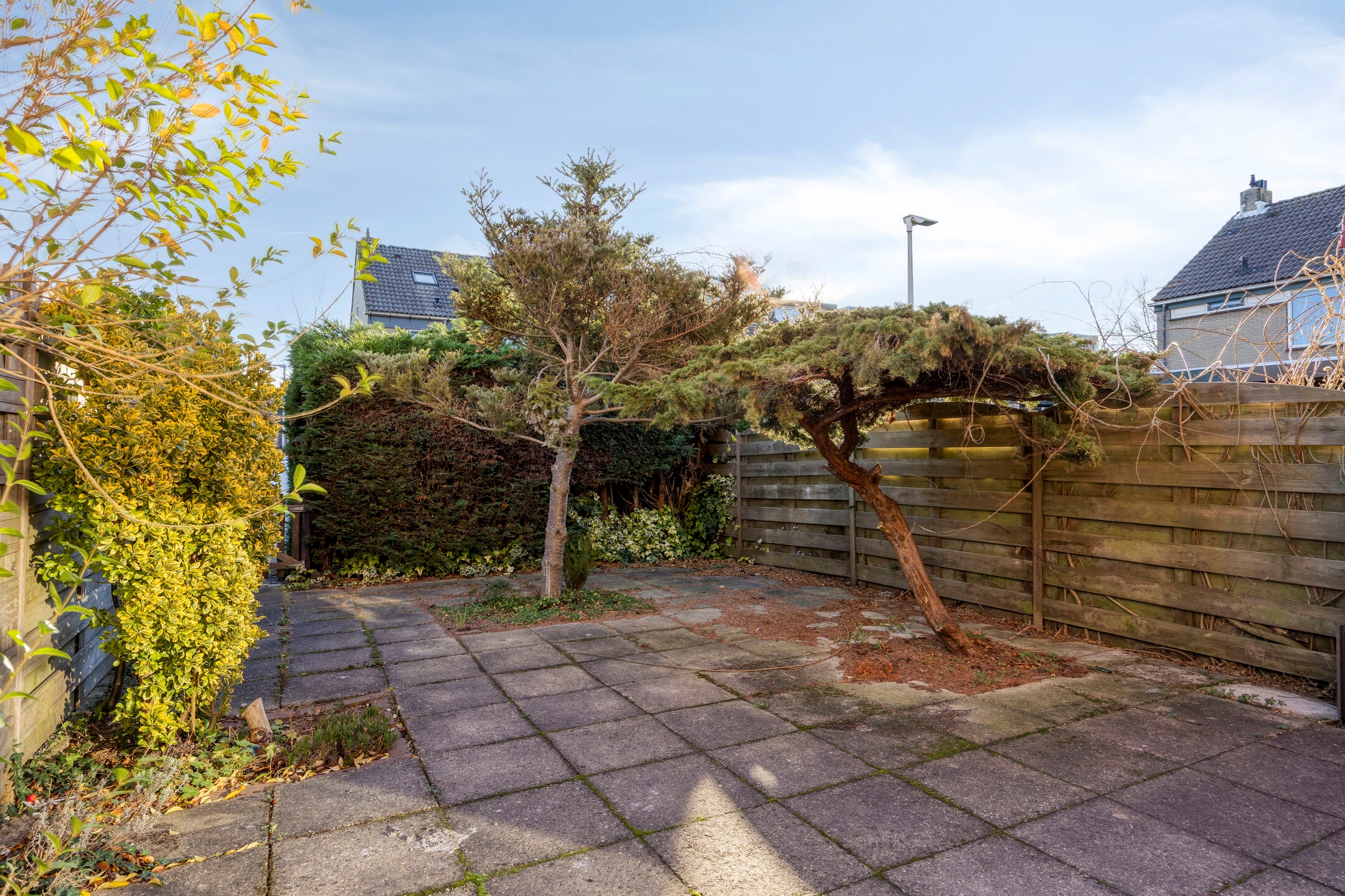 Achtertuin, met een gunstige ligging op het zuidoosten, voorzien van diverse groen, bestrating, elektrische zonwering, een tuinberging en een achterom.