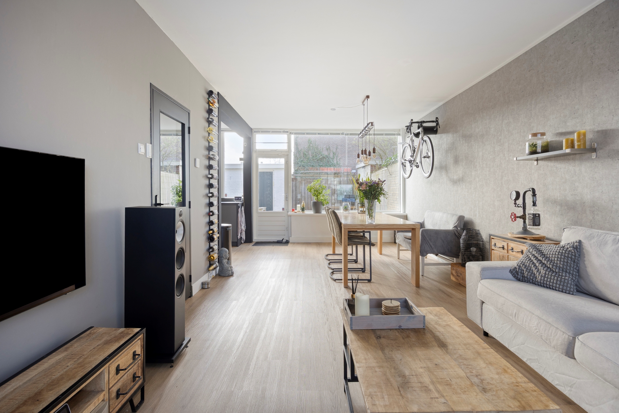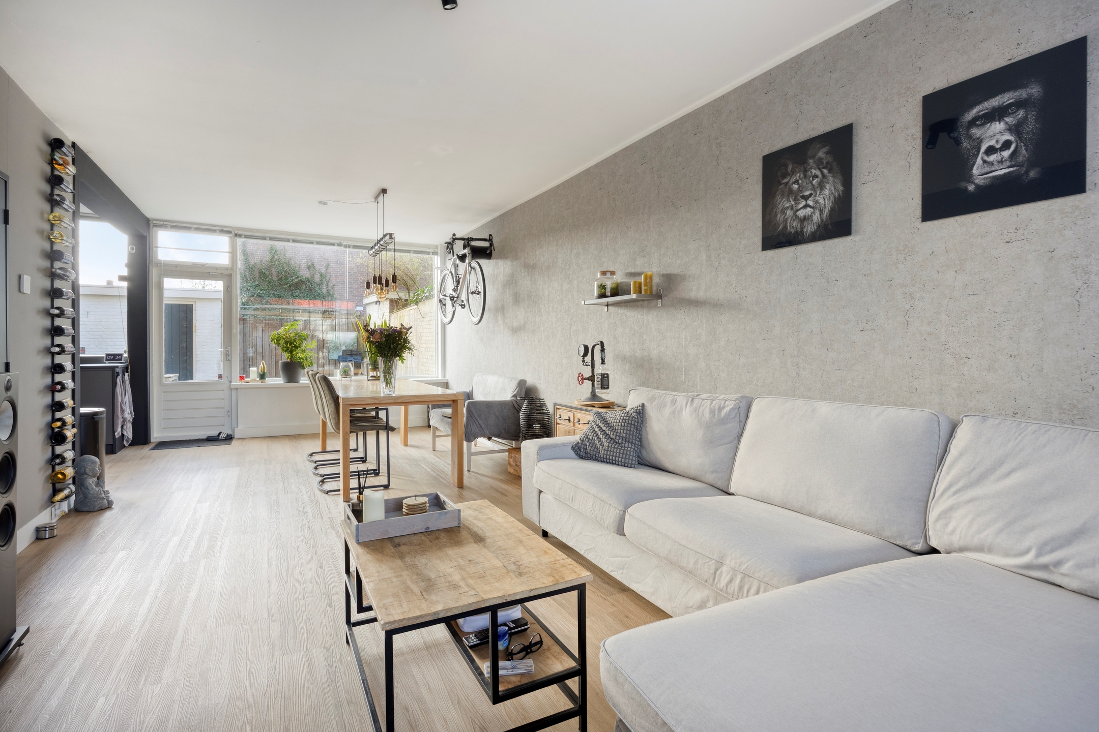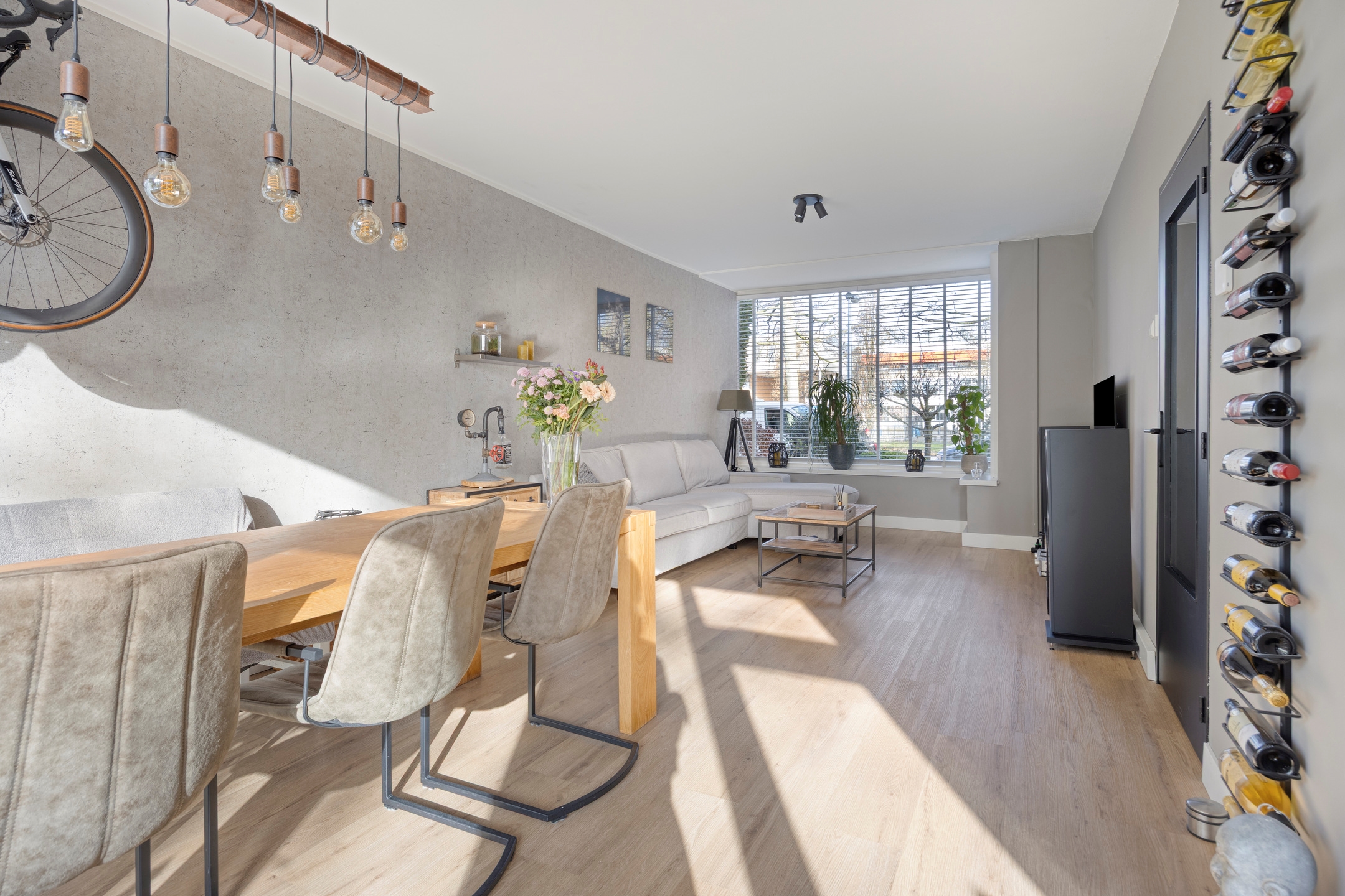 Woonkamer, een sfeervolle en lichte doorzon woonkamer met uitzicht op de singel. De kamer bevat een erker aan de voorzijde en eveneens vloerverwarming, en biedt toegang tot de achtertuin.