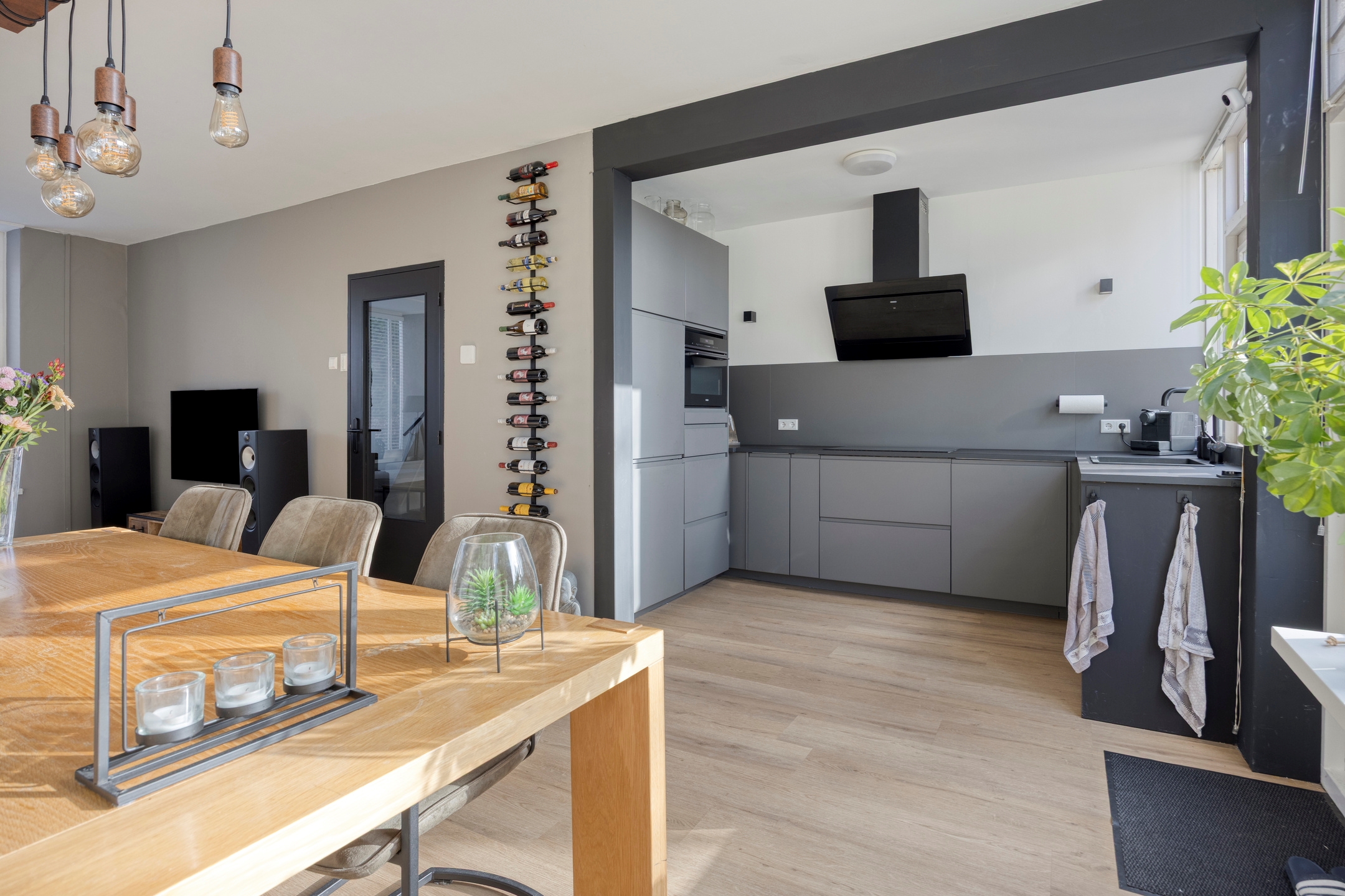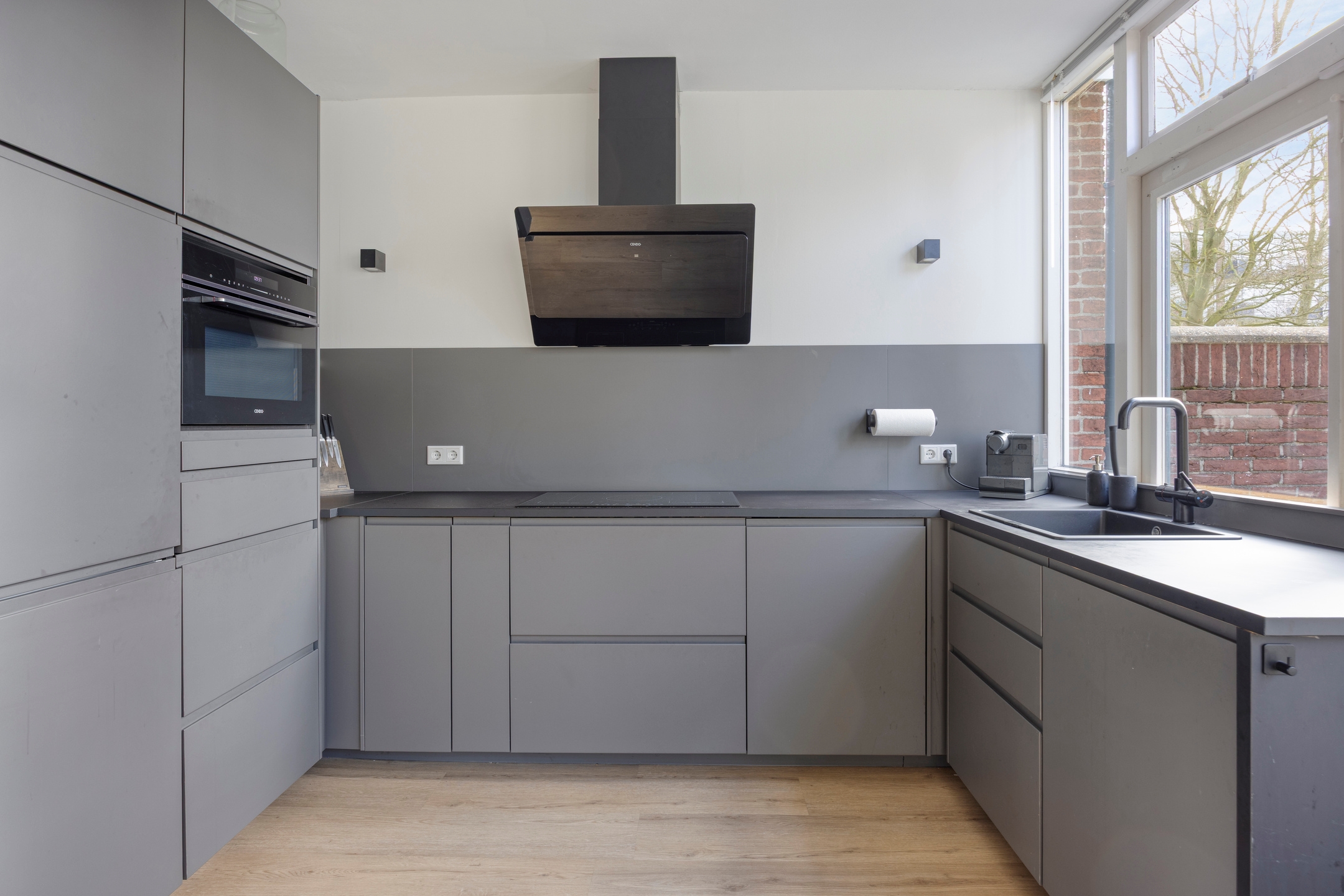 Keuken (2021), een open keuken aan de achterzijde met een keukenblok in U-vormige optelling, beschikt over een inductiekookplaat met design afzuigkap, combioven, vaatwasser, koel/vriescombinatie, kokend waterkraan, veel kastruimte en vloerverwarming.