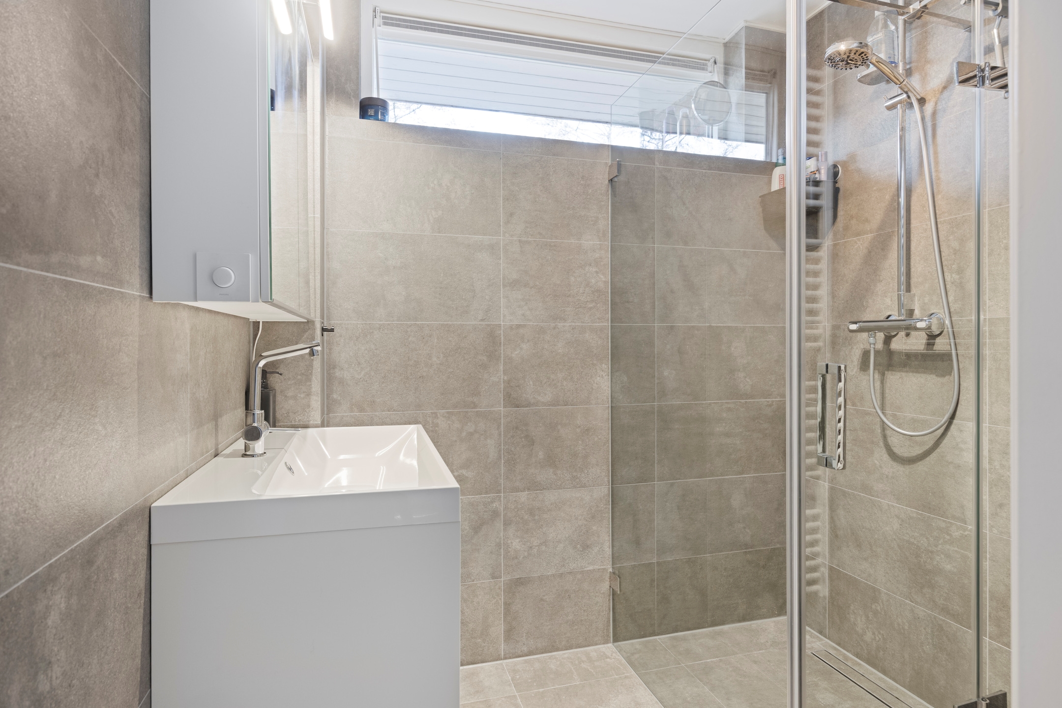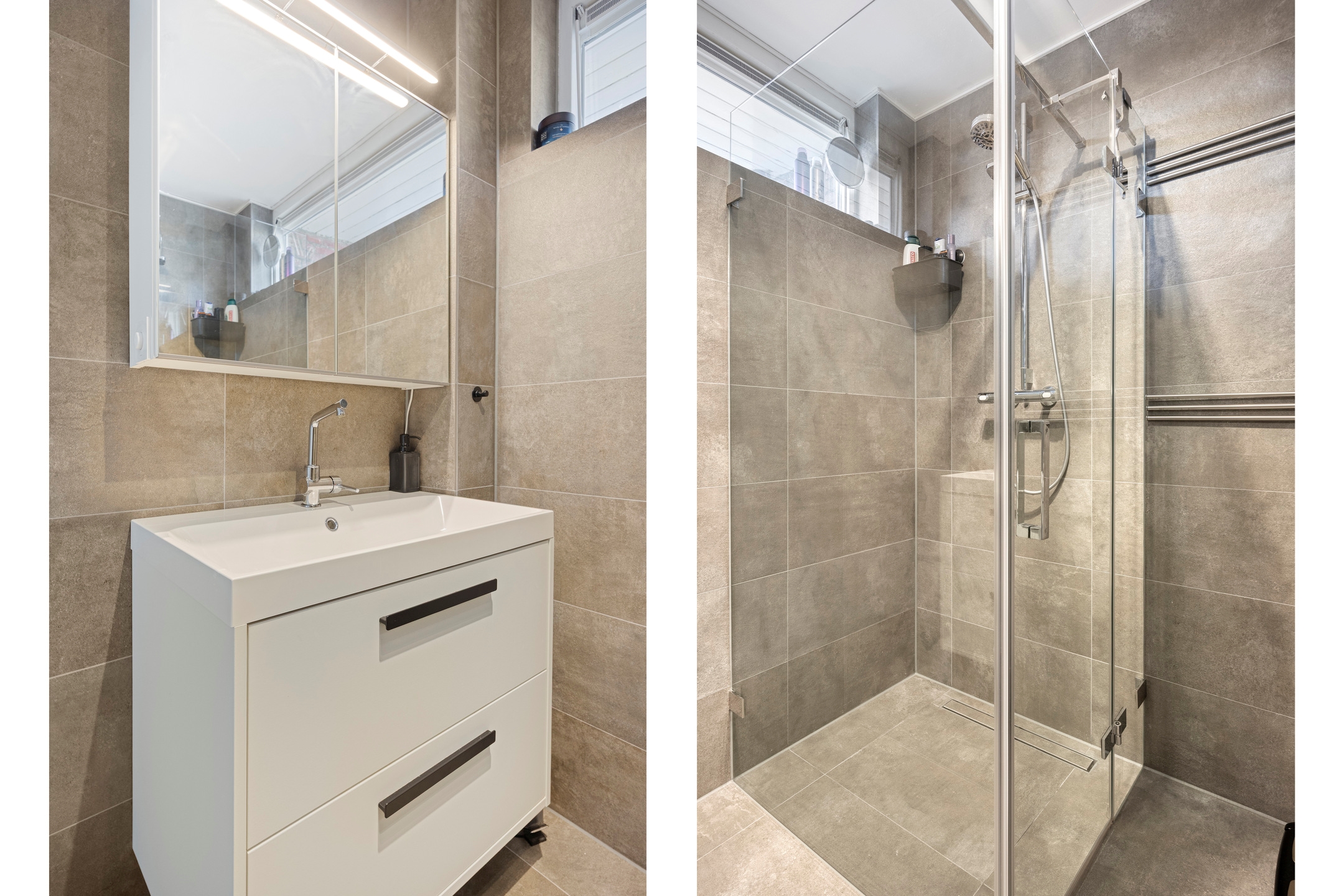 Badkamer, moderne en geheel betegelde ruimte, voorzien van een inloopdouche met thermostaatkraan, wastafel met onderladen en spiegelkast met verlichting, en een badkamerradiator.