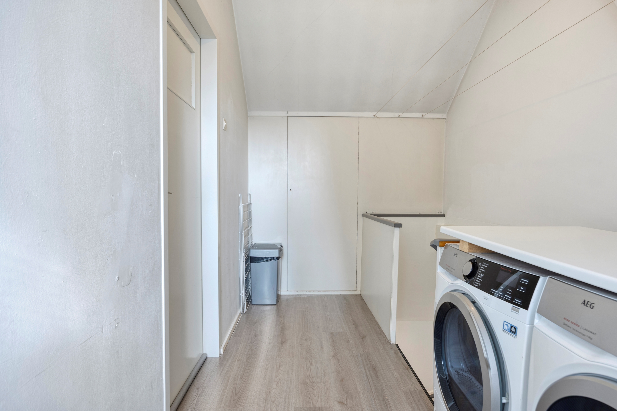 Overloop, biedt toegang tot slaapkamer 4, wasmachine- en drogeraansluiting, opstelling cv-ketel, een bergkast aan de voorzijde en bergruimte achter het knieschot aan de achterzijde.