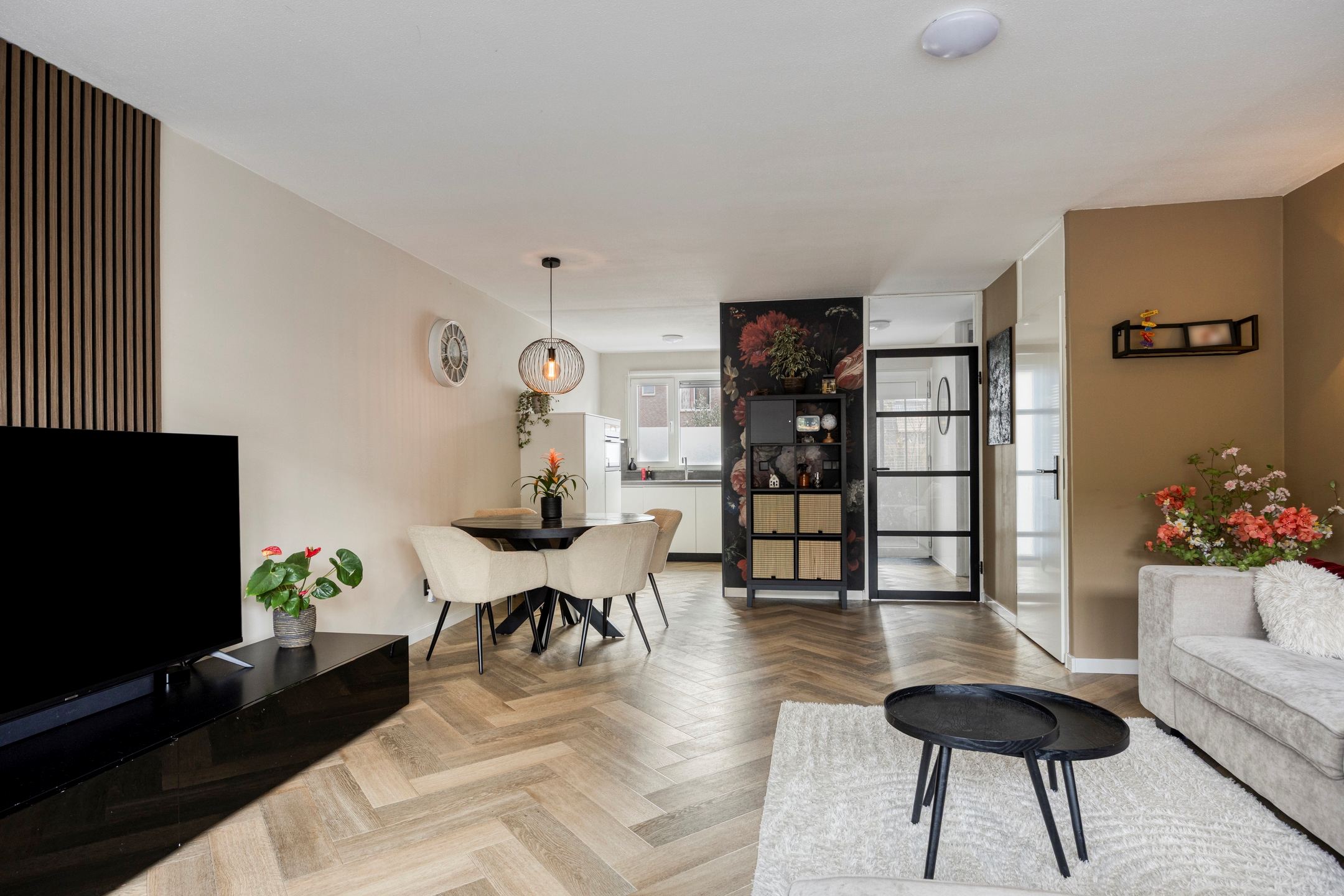 Woonkamer, een fraai afgewerkte en gezellige woonkamer met toegang tot de achtertuin en een vaste kast onder de trap.