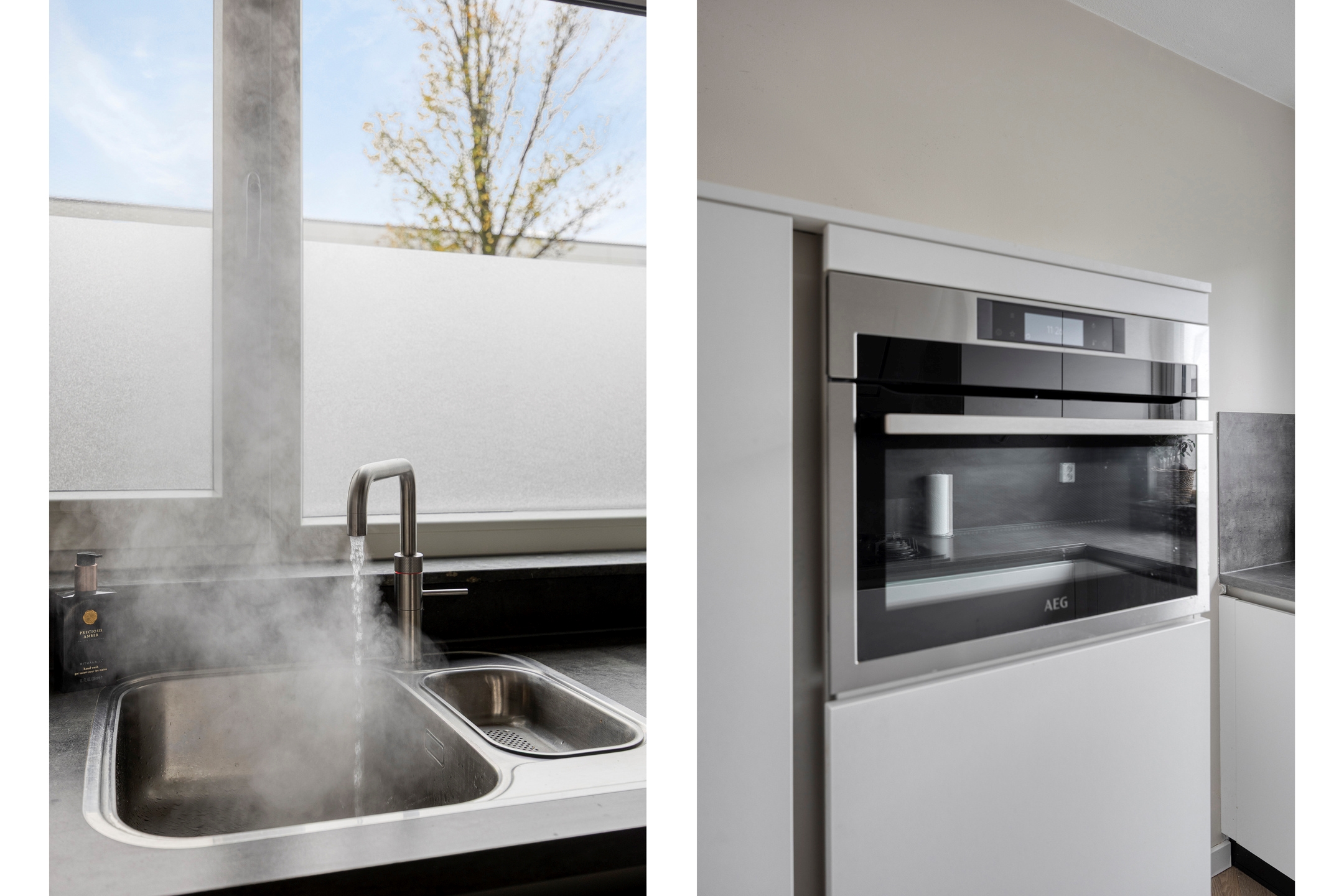 Keuken, gelegen aan de voorzijde van de woning, voorzien van een gaskookplaat met afzuigkap, Quooker (2025), vaatwasser, combioven (2025), koelkast en vriezer.