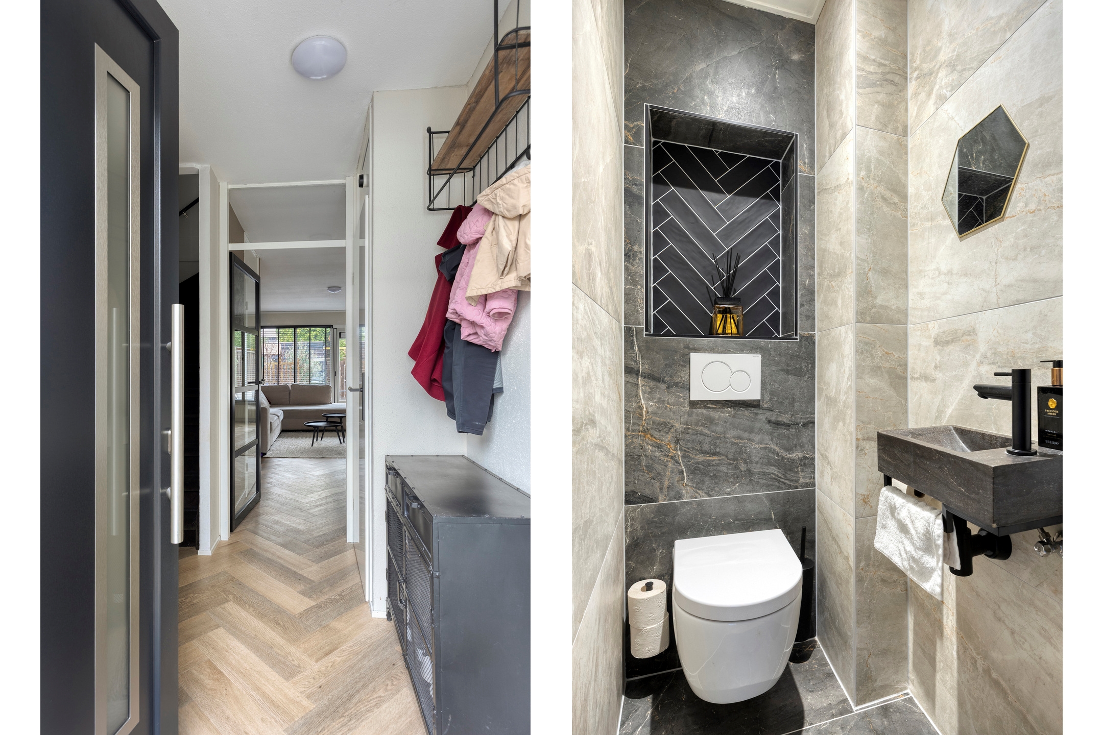 Entree/hal, met toegang tot de woonkamer, toilet, meterkast en gestoffeerde trapopgang naar de eerste verdieping.