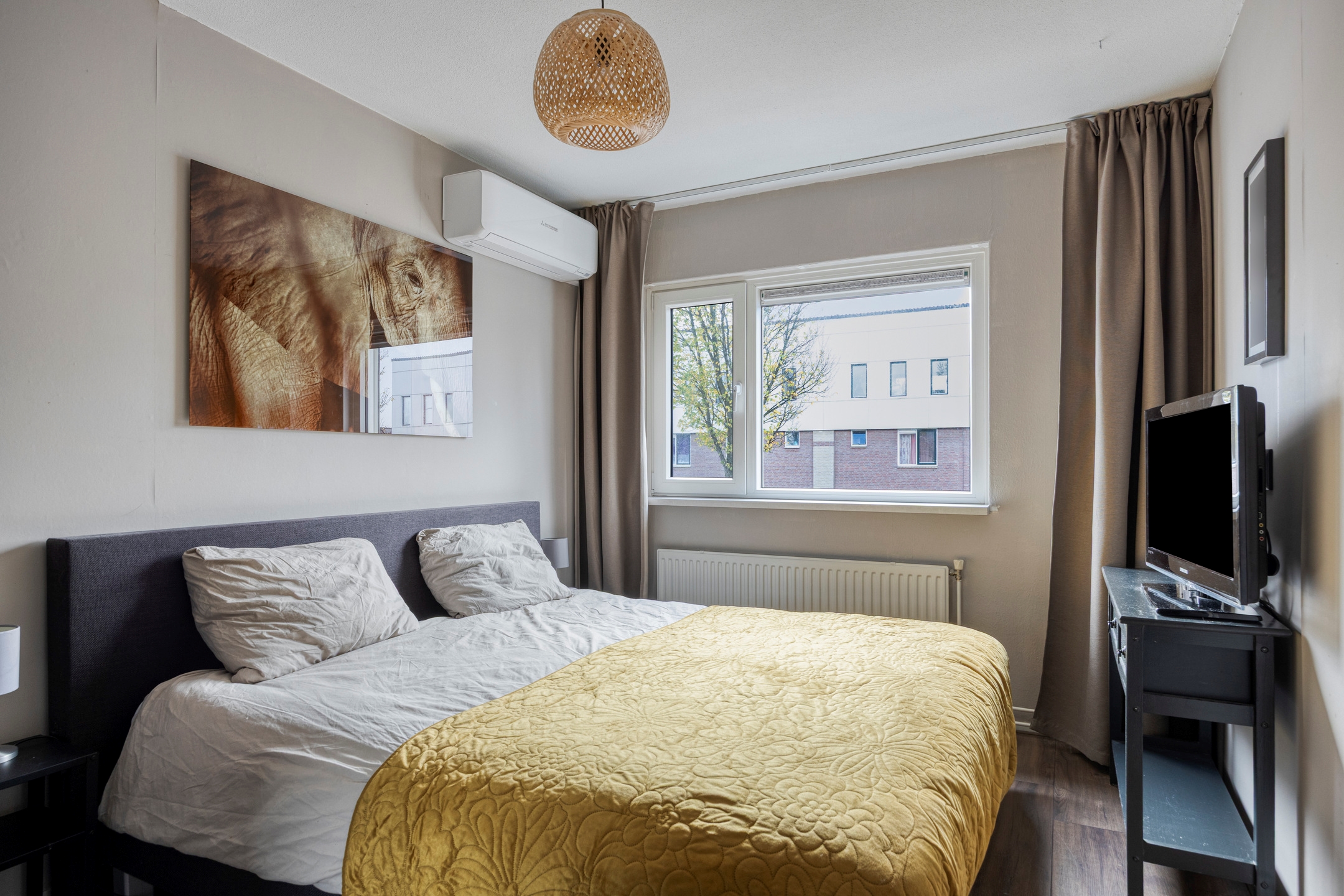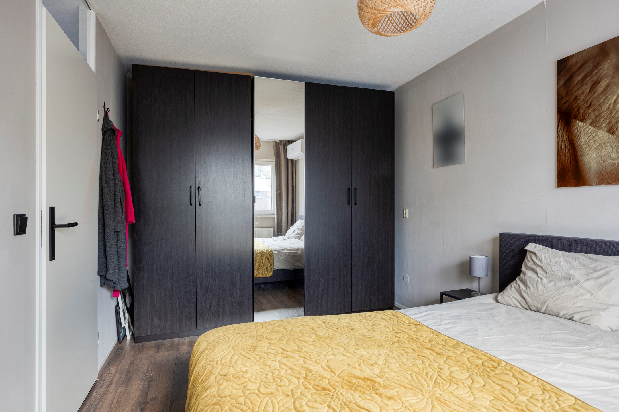 Slaapkamer 1, een ruime kamer gelegen aan de voorzijde, voorzien van airconditioning en een vernieuwd kunststof kozijn met elektrisch rolluik