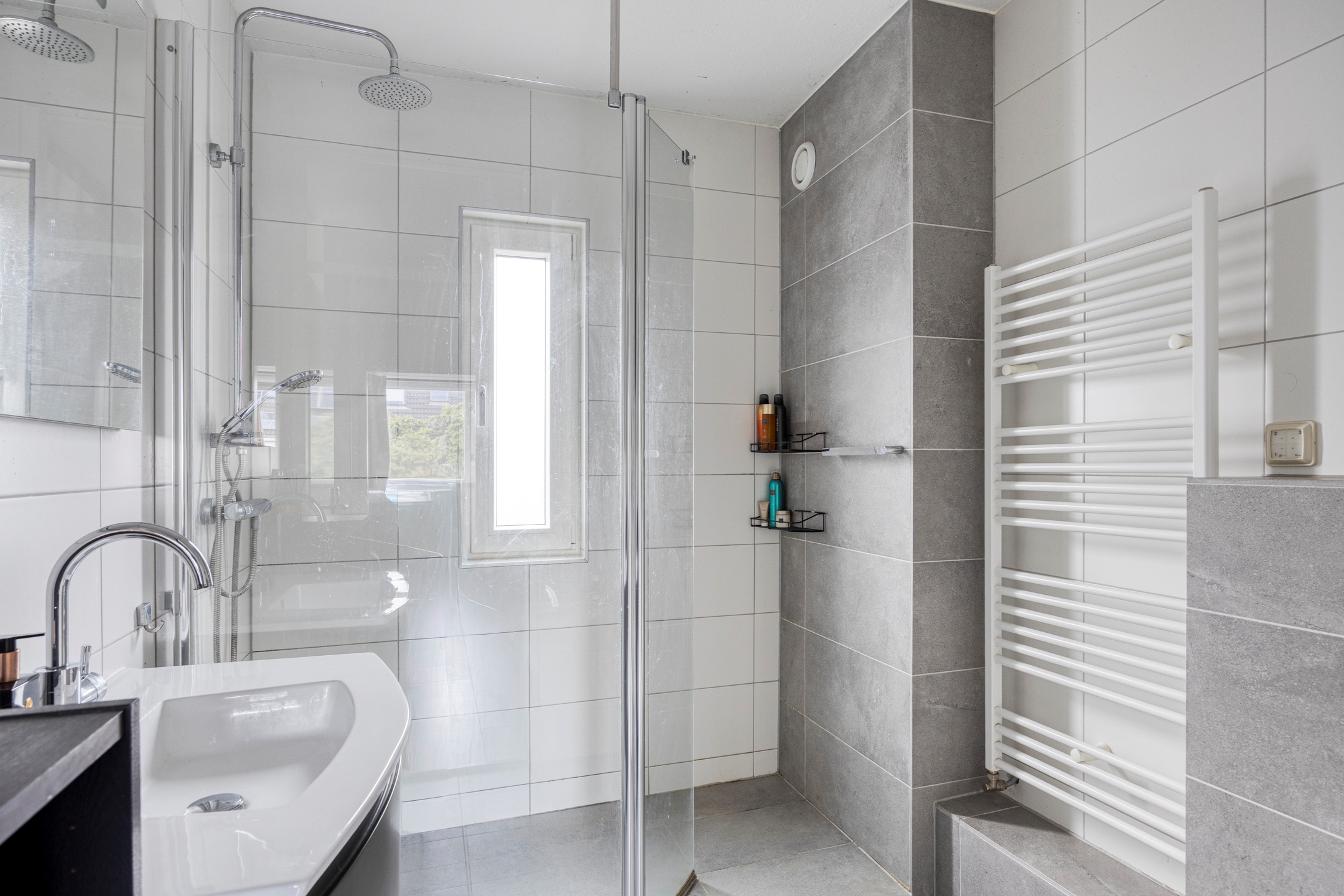 Badkamer, een moderne en geheel betegelde badkamer, voorzien van een inloopdouche met thermostaatkraan, rainshower en handdouche, wastafel met onderladen en een spiegel met verlichting, een tweede toilet (hangend closet), badkamerradiator, mechanische ventilatie en een te openen raam.