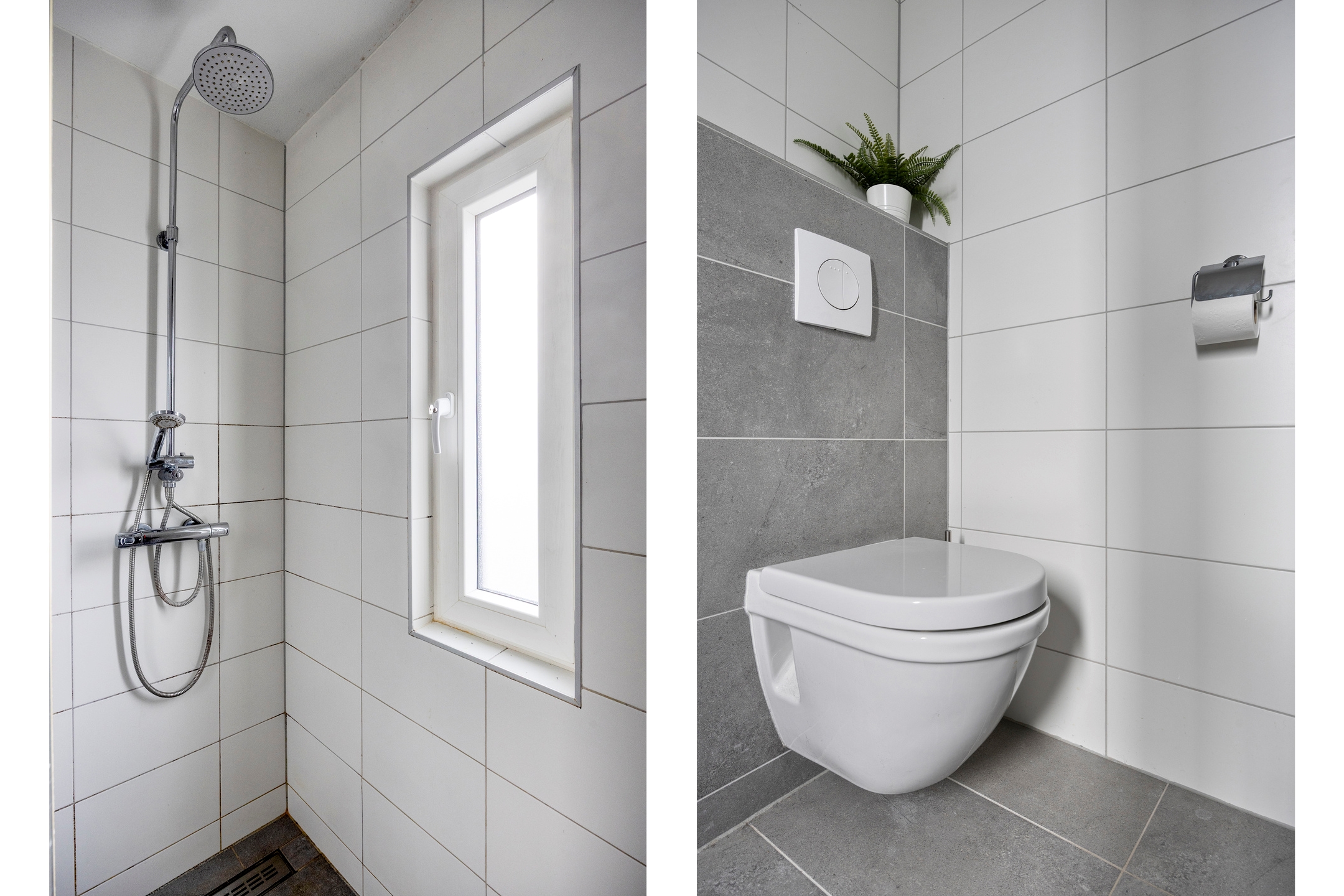 Toilet (2025), geheel betegeld, voorzien van een hangend closet, fonteintje en mechanische ventilatie.