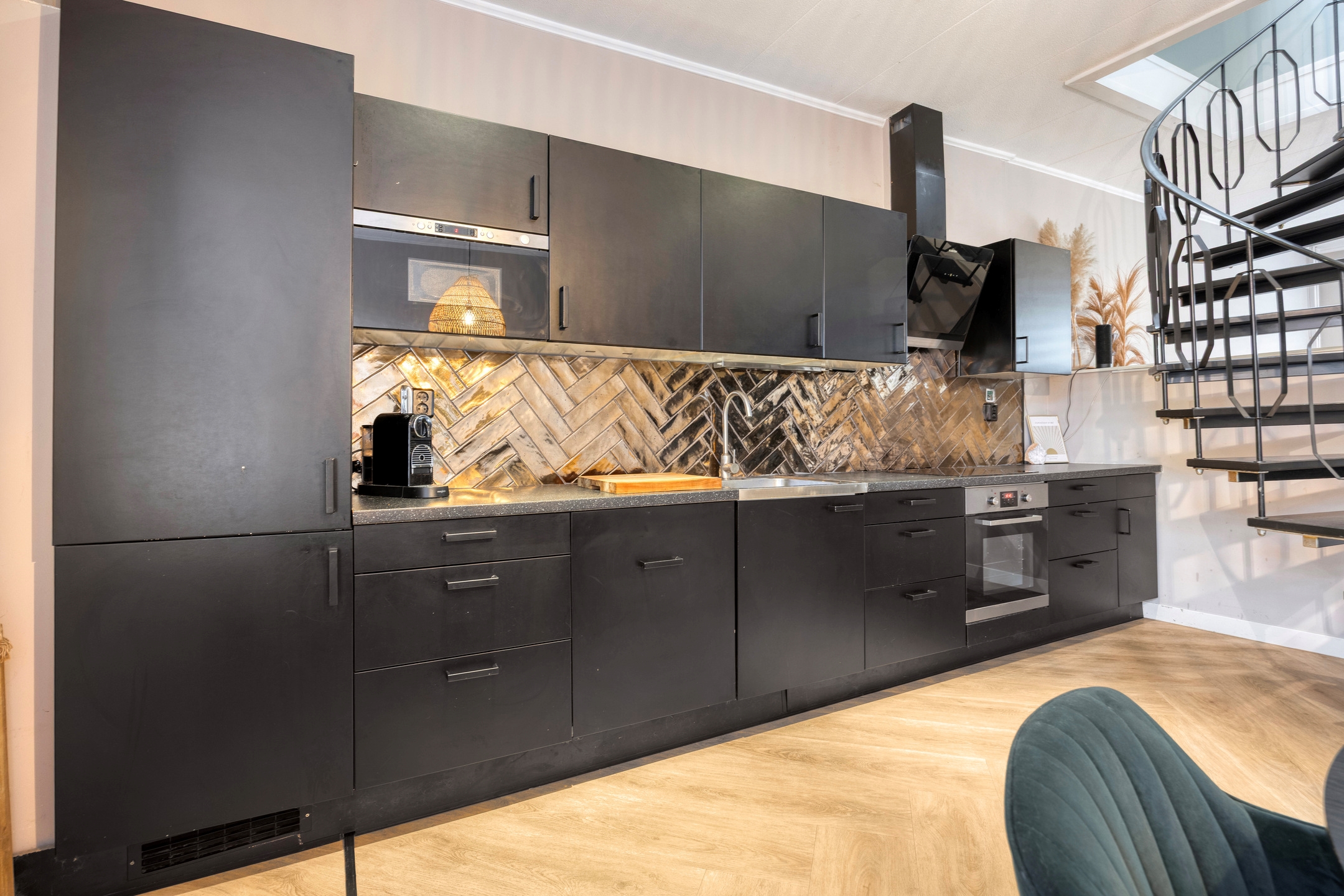 Keuken, een open woonkeuken aan de achterzijde, voorzien van een recht keukenblok, beschikt over een inductiekookplaat met afzuigkap, oven, vaatwasser en een koel/vriescombinatie.