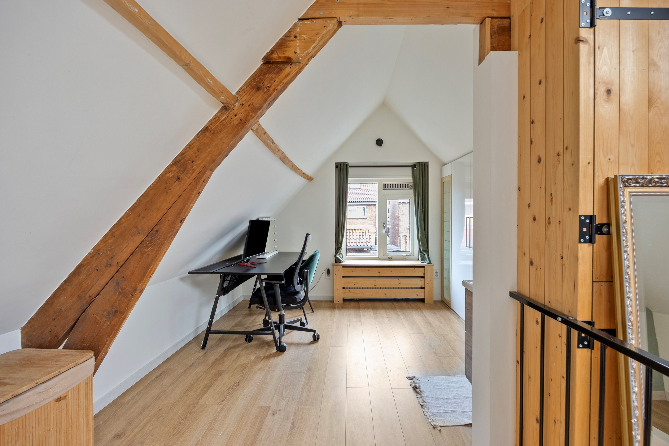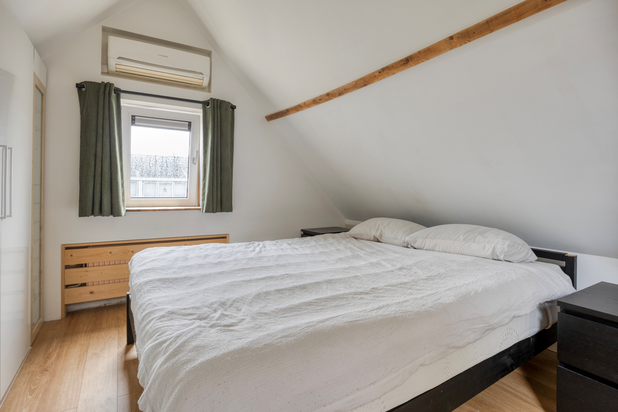 Slaapkamer 2, een grote open kamer aan de achterzijde, voorzien van een vaste kastenwand, wastafel, opstelling cv-ketel (boven de trap) en een Velux dakraam.