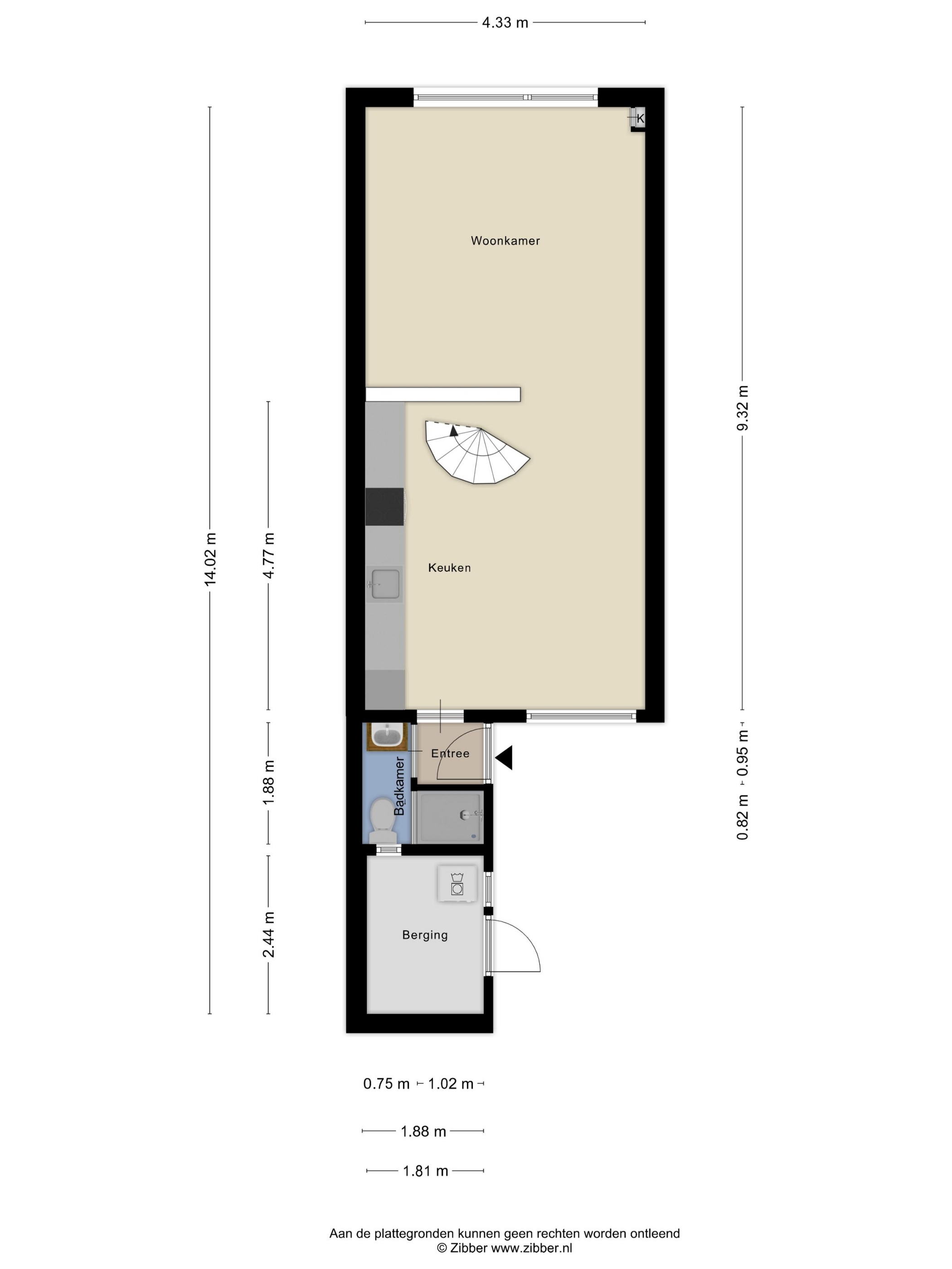 Entree/hal aan de achterzijde van de woning, met toegang tot de woonkeuken/woonkamer en de badkamer/toilet. Tussen de woonkeuken en woonkamer biedt een spiltrap toegang tot de eerste verdieping.