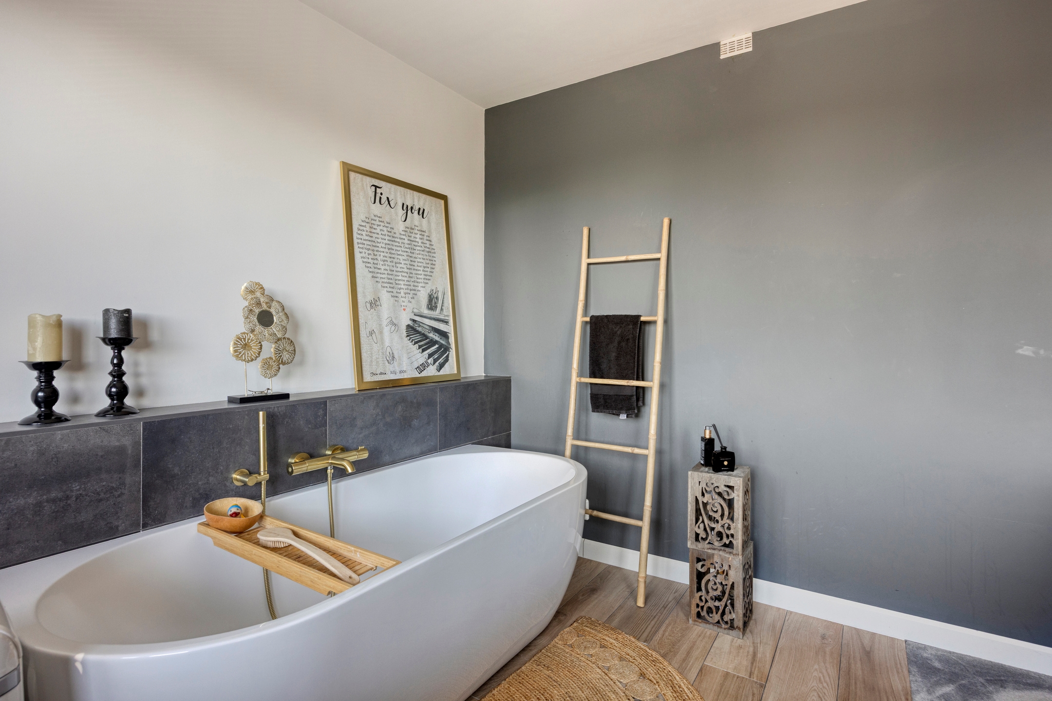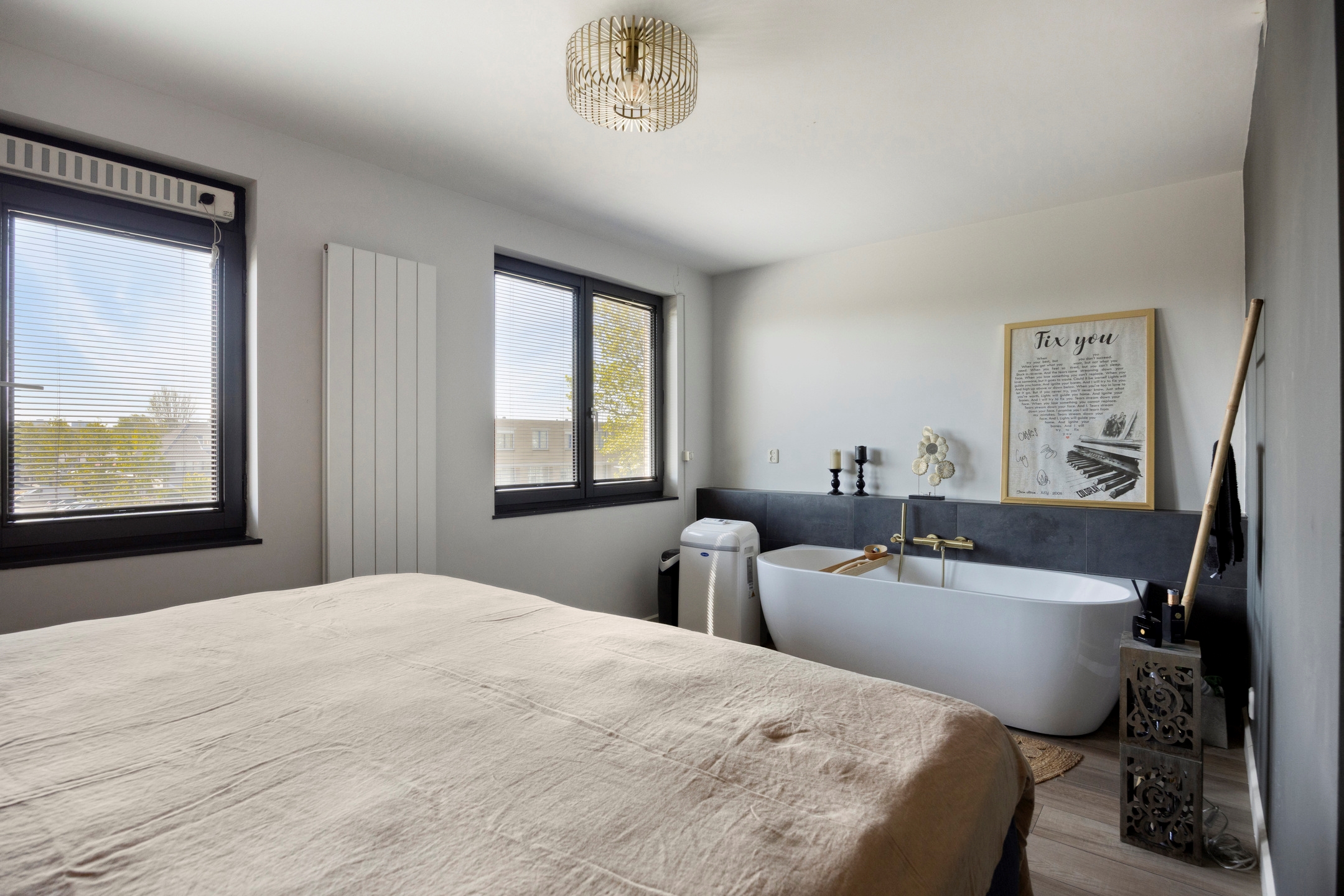 Slaapkamer 1, een royale kamer aan de achterzijde, met een luxe ligbad met thermostaatkraan en handdouche. De vloer rondom het ligbad is afgewerkt met keramische tegels verder ligt er tapijt op de rest van de vloer en er zijn elektrische rolluiken aanwezig.