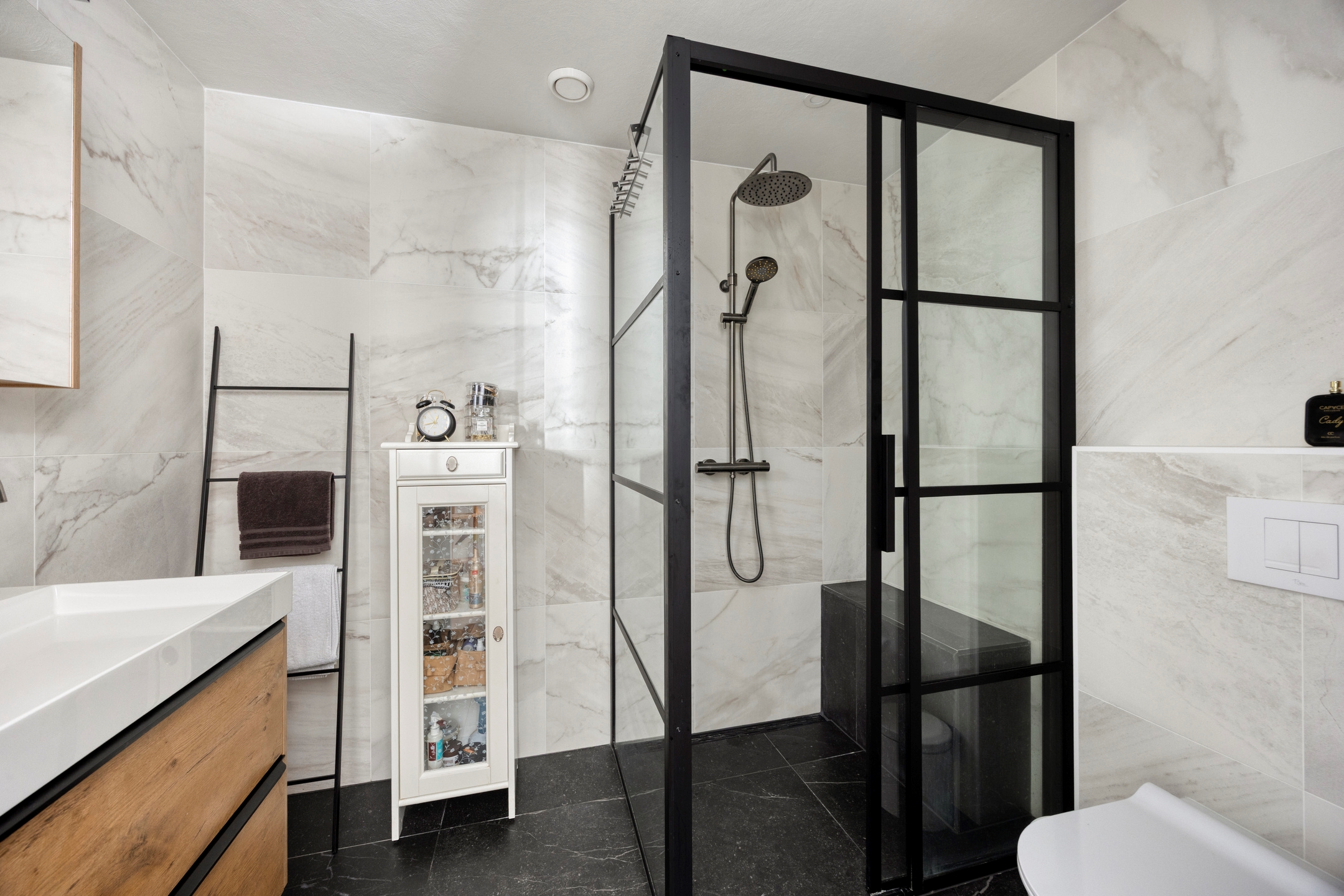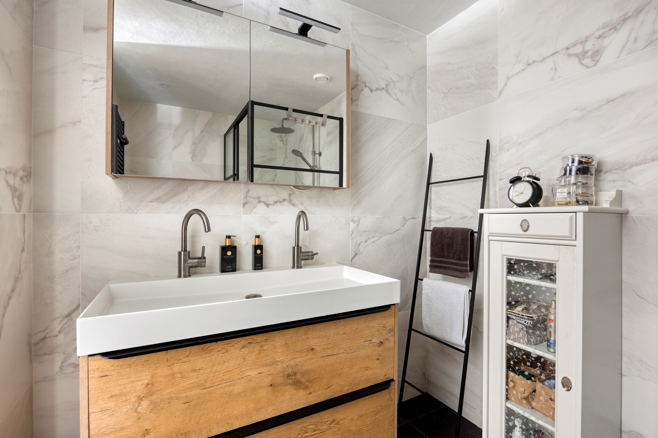 Badkamer (eind 2021), geheel betegeld, voorzien van een inloopdouche met thermostaatkraan, handdouche en rainshower, een brede wastafel met 2 mengkranen, onderladen en spiegelkast met verlichting, een tweede toilet (hangend closet), badkamerradiator en mechanische ventilatie.